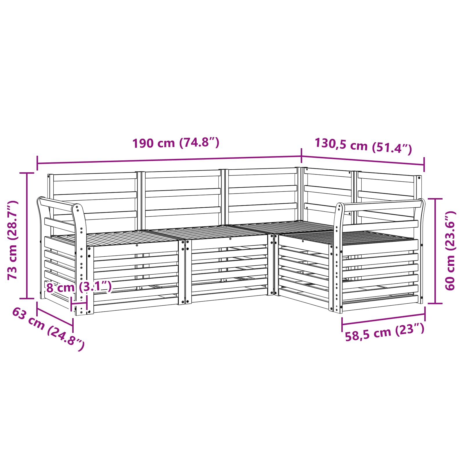 - 3 x Canapea mijloc: 63 x 59 x 73 cm (LxWxH)