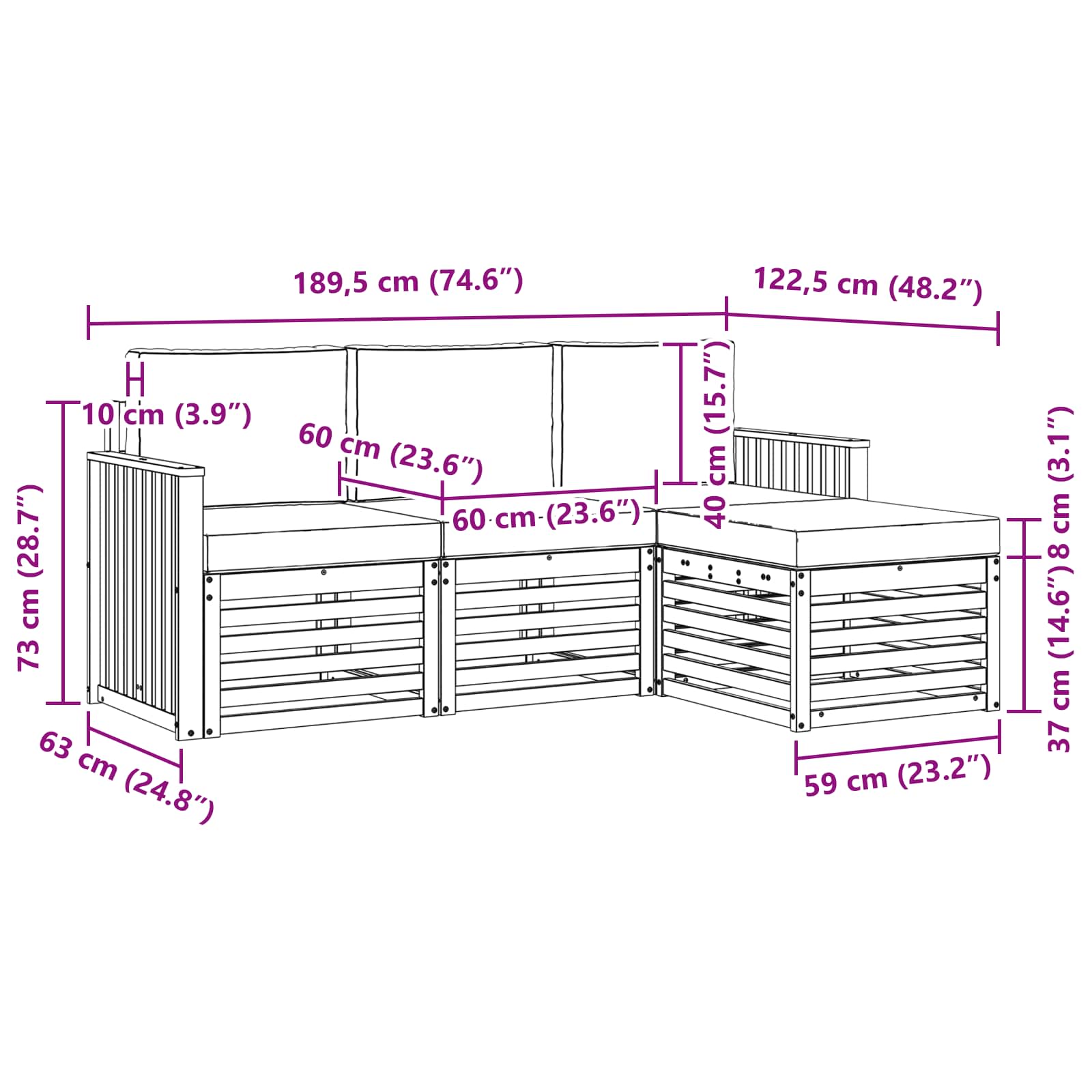 - 3 x canapea mijlocie: 63 x 59 x 73 cm (LxWxH)