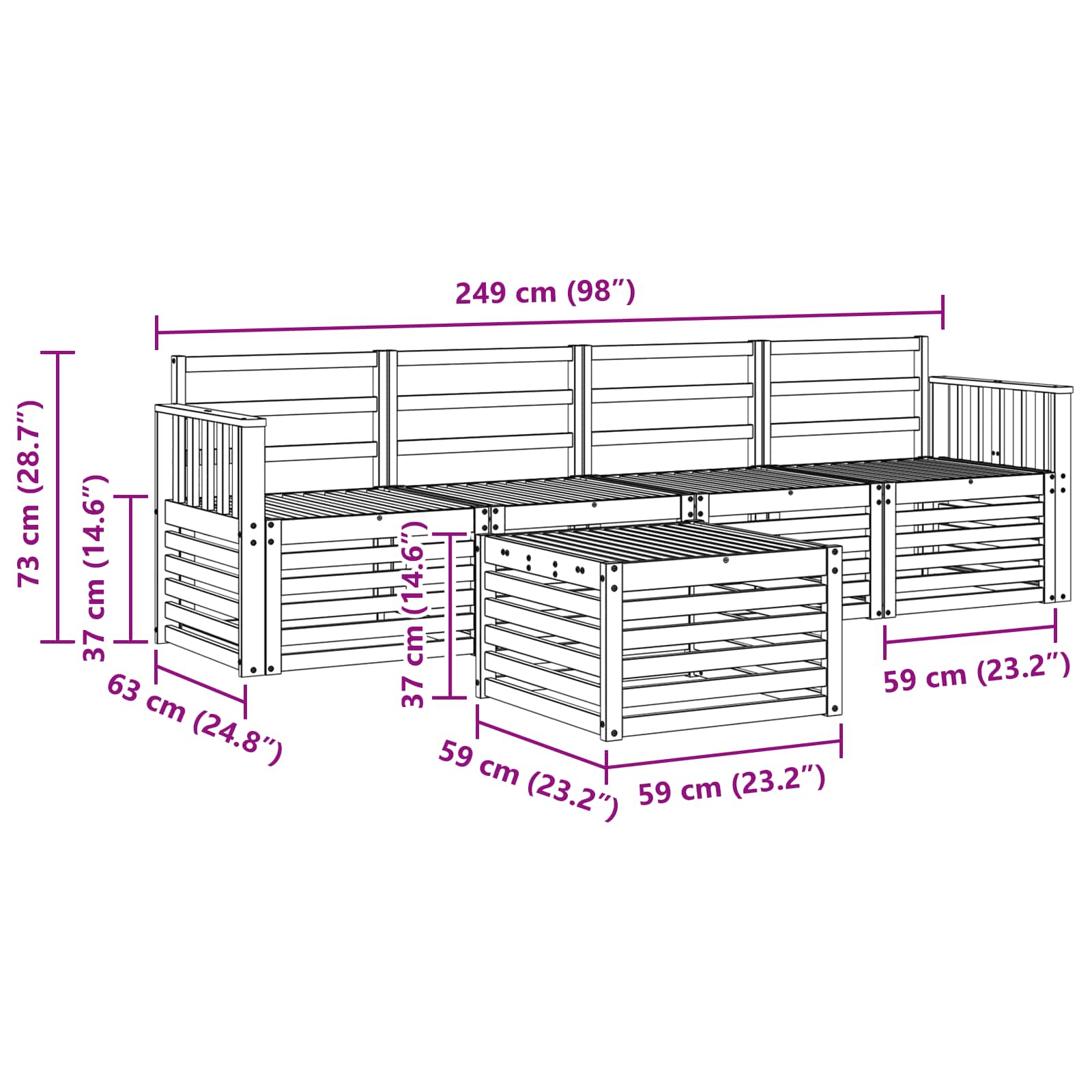 - 4 x Sofa din mijloc: 63 x 59 x 73 cm (LxWxH)