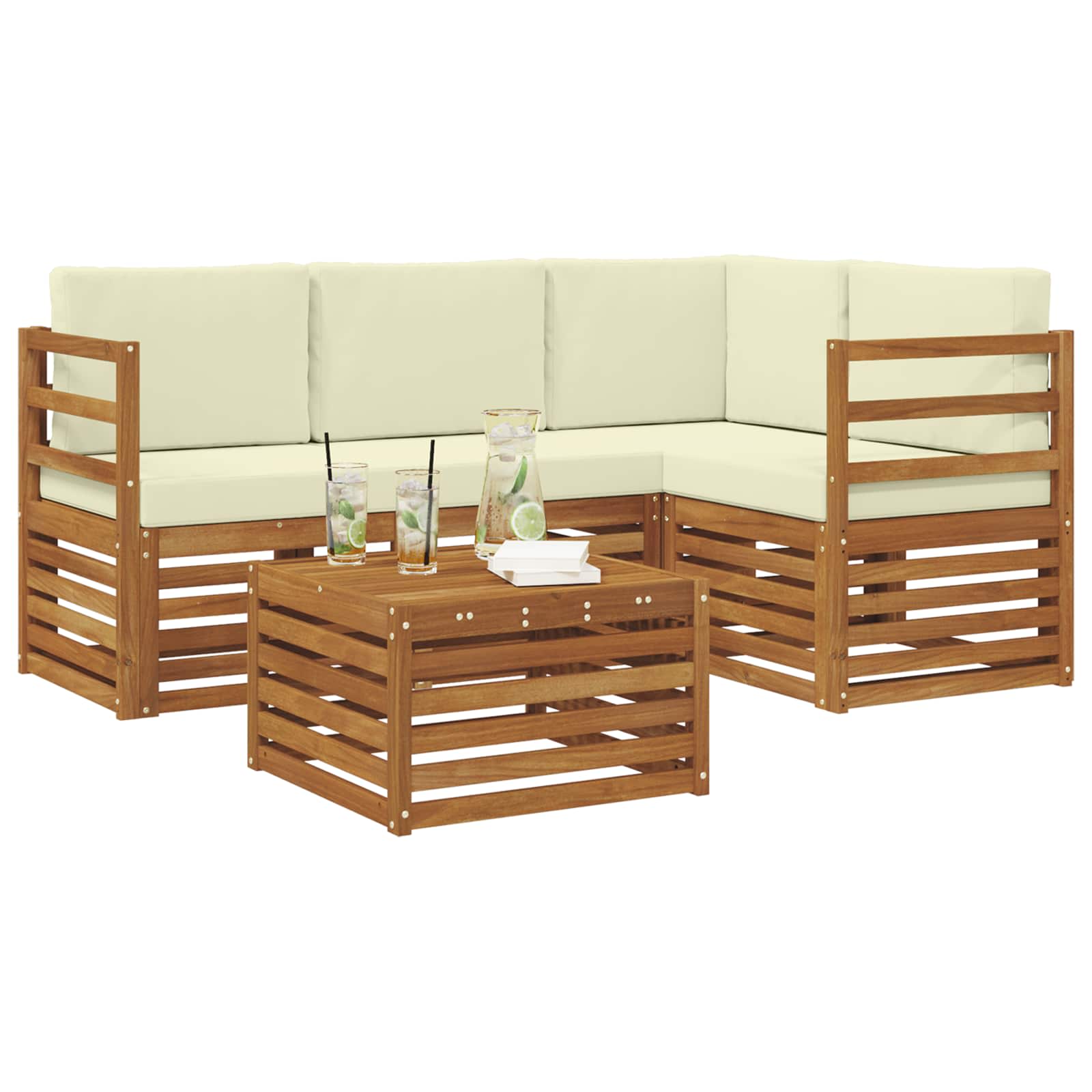 Acest set de canapea sectională pentru exterior aduce împreună un design modern cu o funcționalitate practică, perfect pentru grădină, terasă sau în jurul piscinei. E realizat din lemn masiv de acacia, având o nuanță frumoasă de maro. Fie că ești cu prietenii sau vrei doar să te bucuri de o cafea, acest set e versatil, permițându-ți să-l aranjezi cum vrei.
