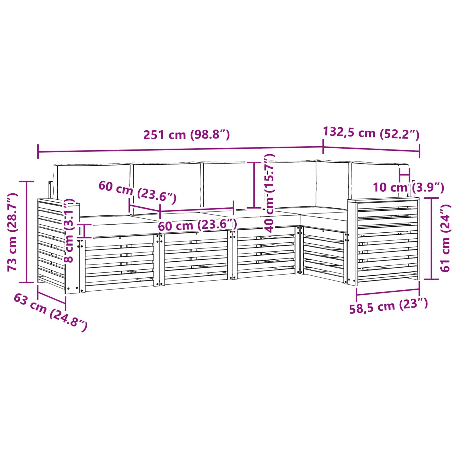 - 6 x Pernă de spate: 60 x 40 x 10 cm (LxWxH)