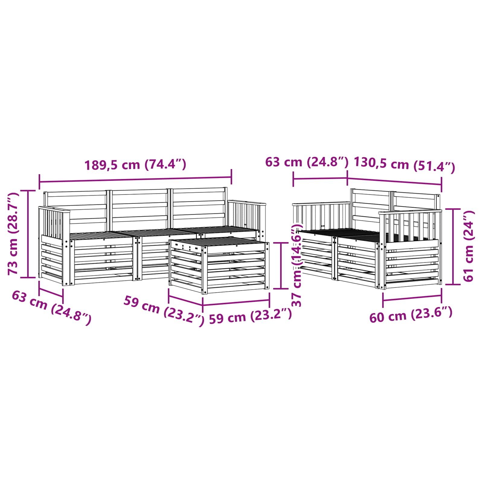 - 4 x Brațe: 60 x 6 x 61 cm (LxÎxH)