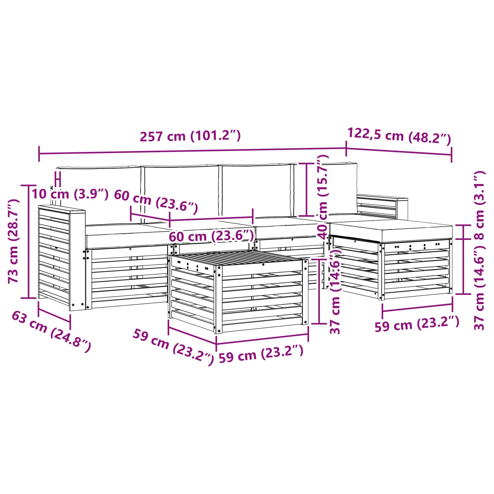 - 5 x Perne de șezut: 60 x 60 x 8 cm (LxWxH)