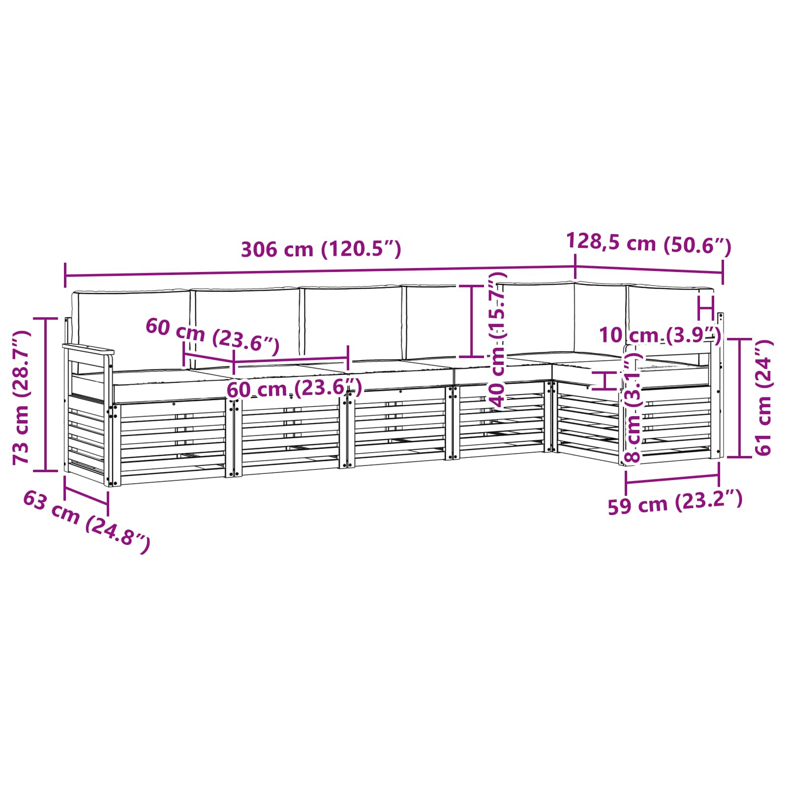 - 5 x Canapea mijloc: 63 x 59 x 73 cm (LxWxH)