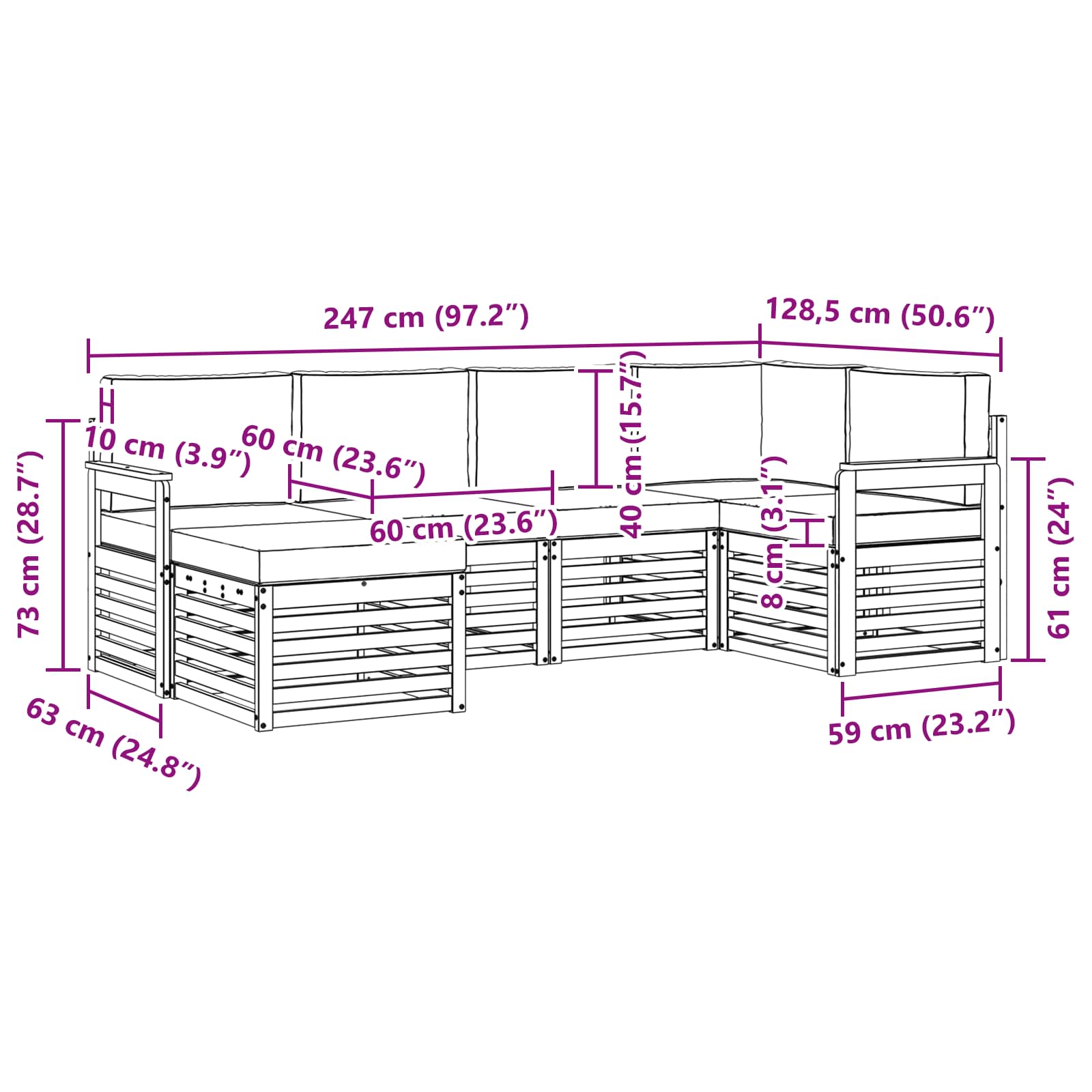 - 6 x Pernă de șezut: 60 x 60 x 8 cm (L x l x H)