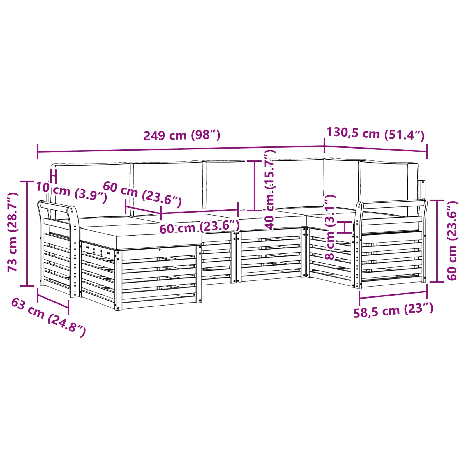 - 4 x Canapea mijloc: 63 x 59 x 73 cm (L x l x H)