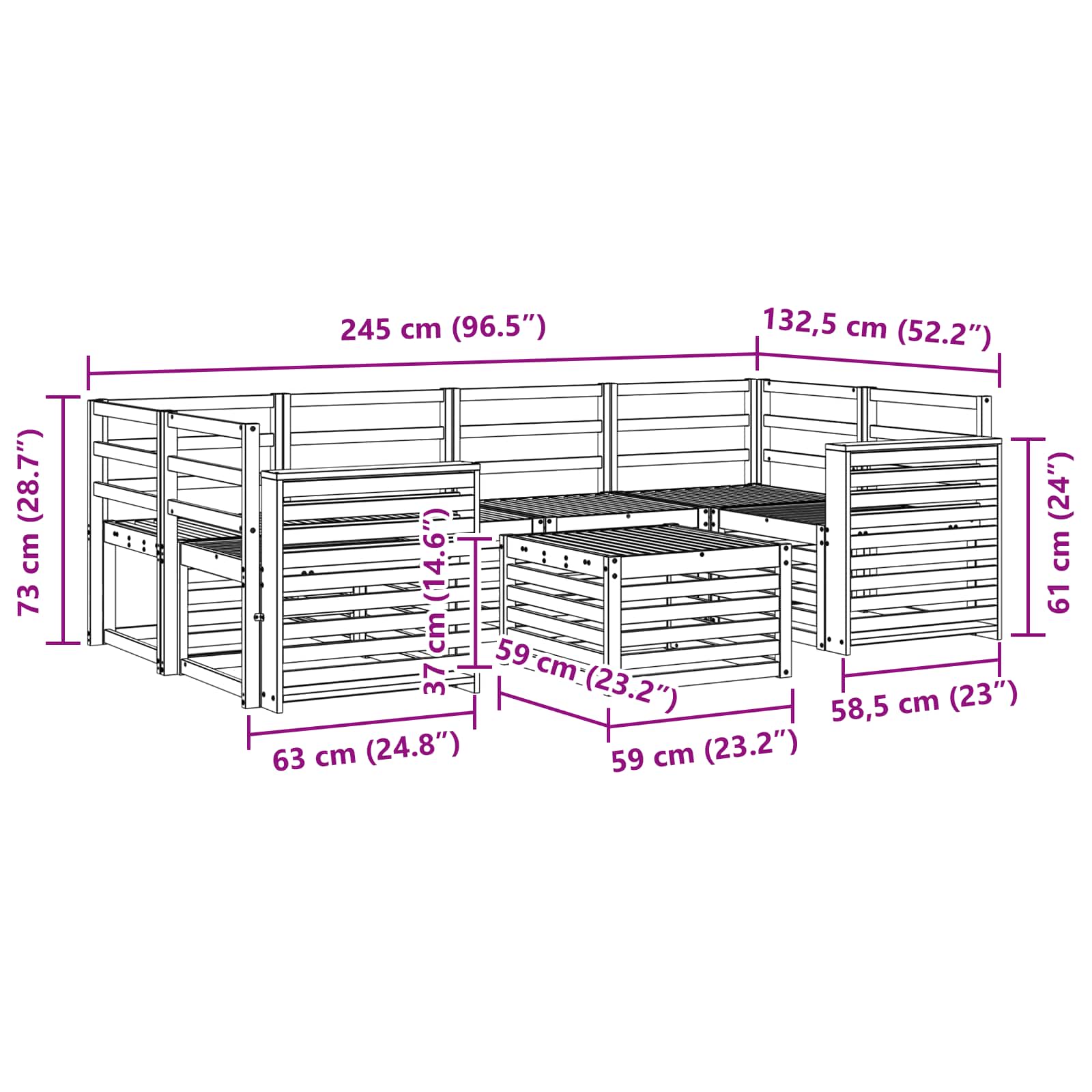 - 4 x canapea de mijloc: 63 x 59 x 73 cm (LxWxH)