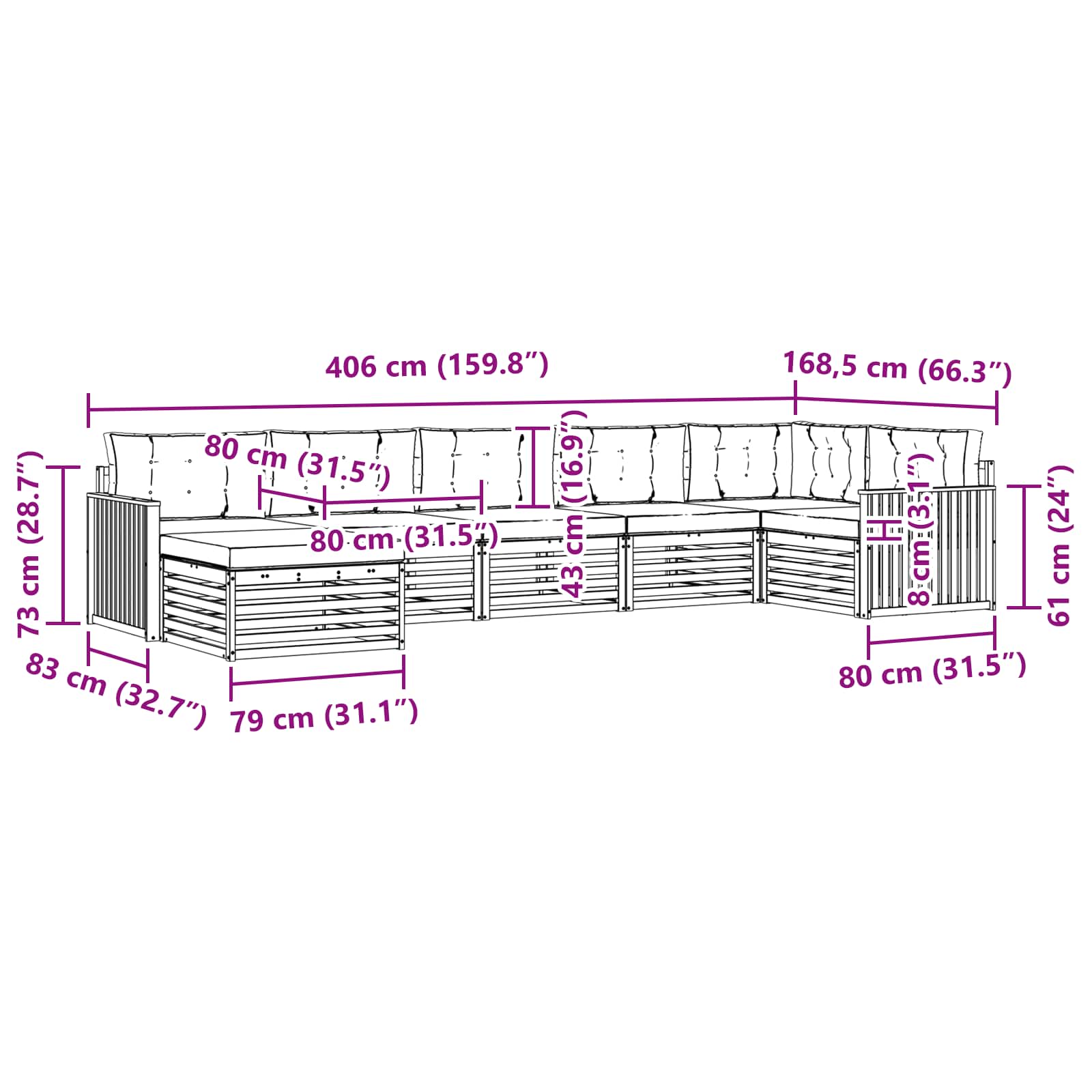 - 7 x perne de șezut: 80 x 80 x 8 cm (LxWxH)