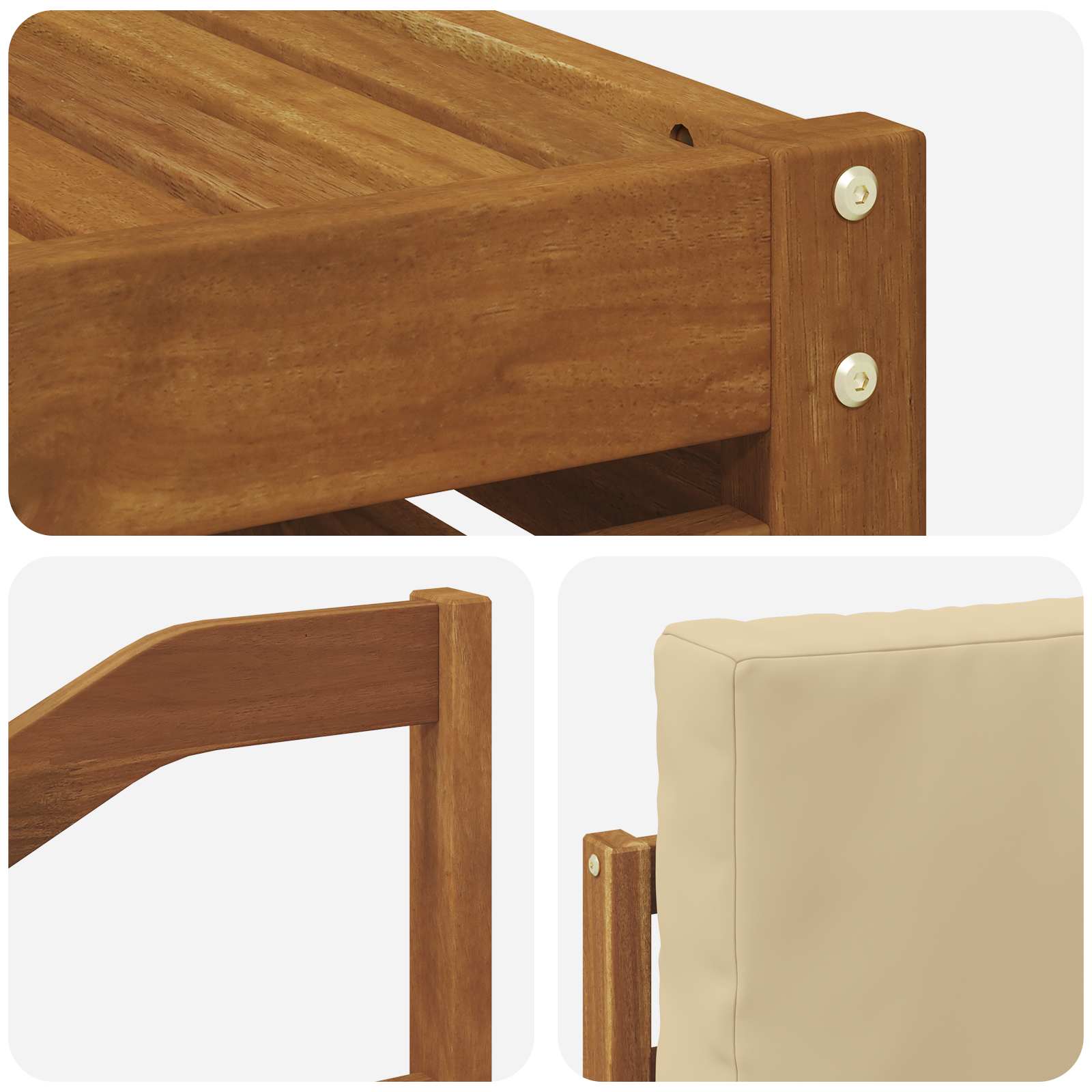 Setul nostru de mobilier pentru exterior combină stilul cu utilitatea, fiind un punct de atracție în orice grădină sau terasă. Are un design modern, cu linii clare și detalii minime, care îți aduce eleganță și te ajută să te relaxezi în aer liber, perfect pentru socializare. Făcut din lemn masiv de acacia, oferă durabilitate și arată bine pe termen lung – ideal pentru cei care vor să îmbine utilul cu estetica în mobilierul de exterior.