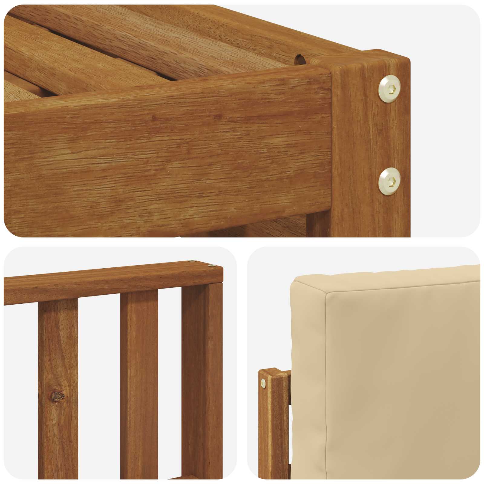 Setul de mobilier pentru exterior combină stilul cu funcționalitatea, făcând din el un punct de atracție pentru orice grădină sau terasă. Designul său modern, cu linii clare și detalii simple, adaugă un strop de eleganță și încurajează relaxarea în aer liber și întâlnirile cu prietenii. Făcut din lemn de acacia, setul acesta garantează durabilitate și un aspect frumos pe termen lung, fiind perfect pentru cei care vor un mobilier practic și stilat.