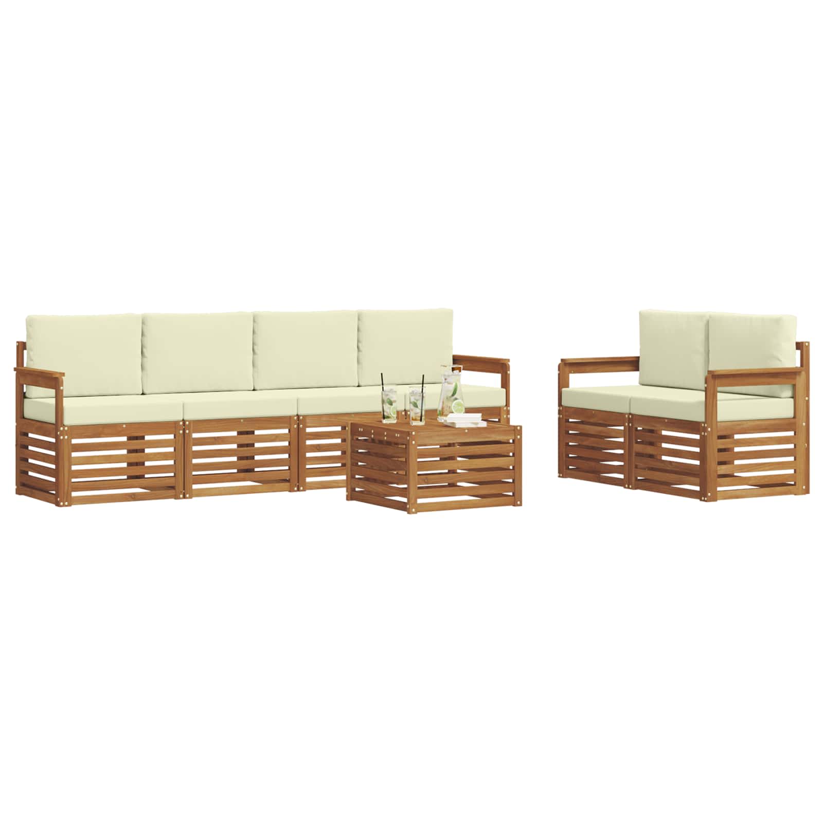 Setul ăsta de mobilier pentru exterior îmbină stilul cu utilitatea, făcându-l piesa centrală ideală pentru orice grădină sau terasă. Are un design modern cu linii curate care aduce eleganță și susține relaxarea și întâlnirile cu prietenii afară. Totul este făcut din lemn masiv de acacia, deci e durabil și arată bine pe termen lung, perfect pentru cei care vor confort, dar și un look rafinat la mobilierul de exterior.