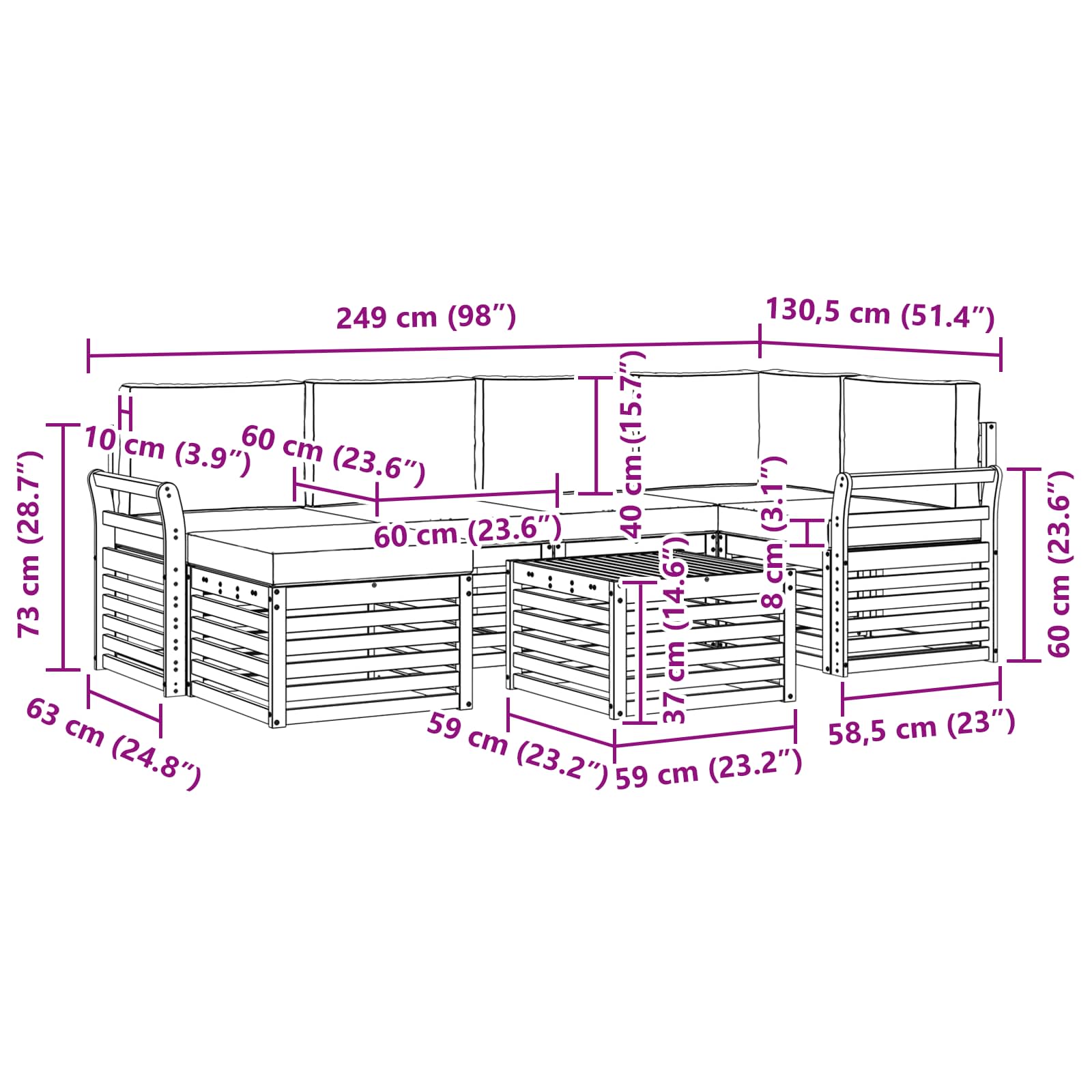 - 6 x Perne de șezut: 60 x 60 x 8 cm (LxWxH)