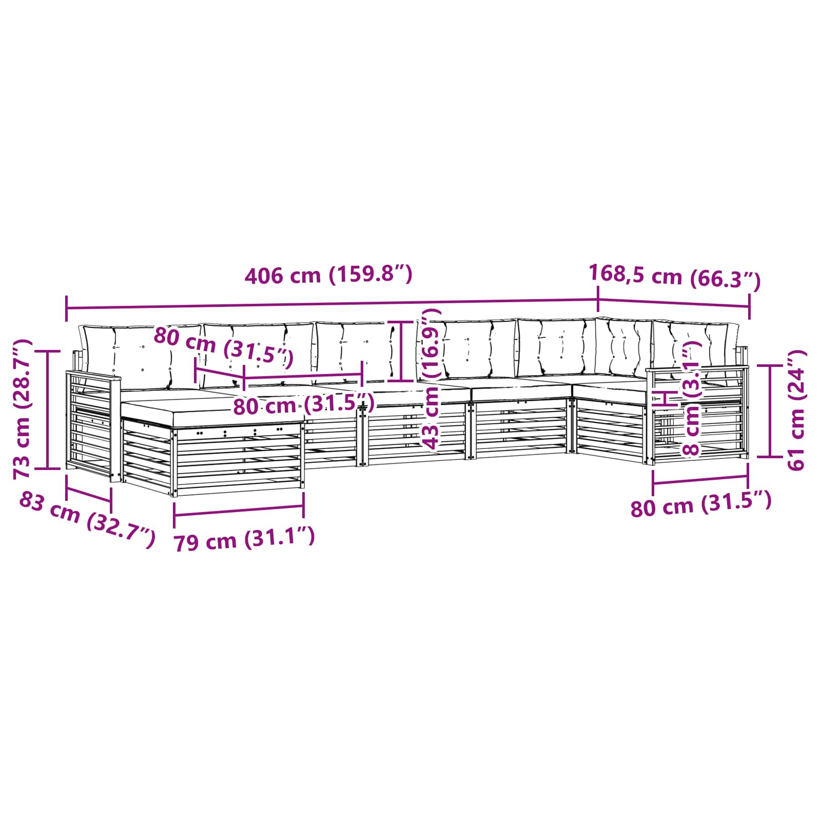- 7 x perne de șezut: 80 x 80 x 8 cm (LxWxH)