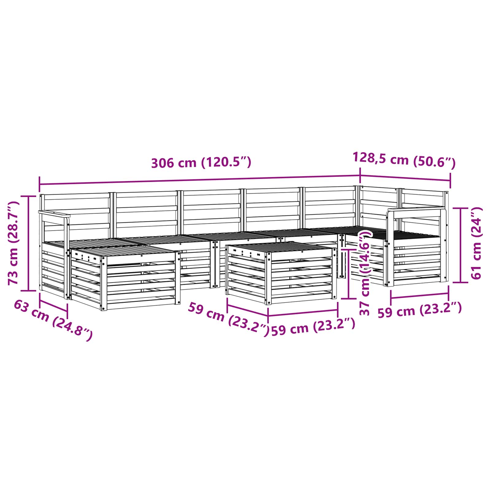 - 5 x canapea de mijloc: 63 x 59 x 73 cm (LxWxH)