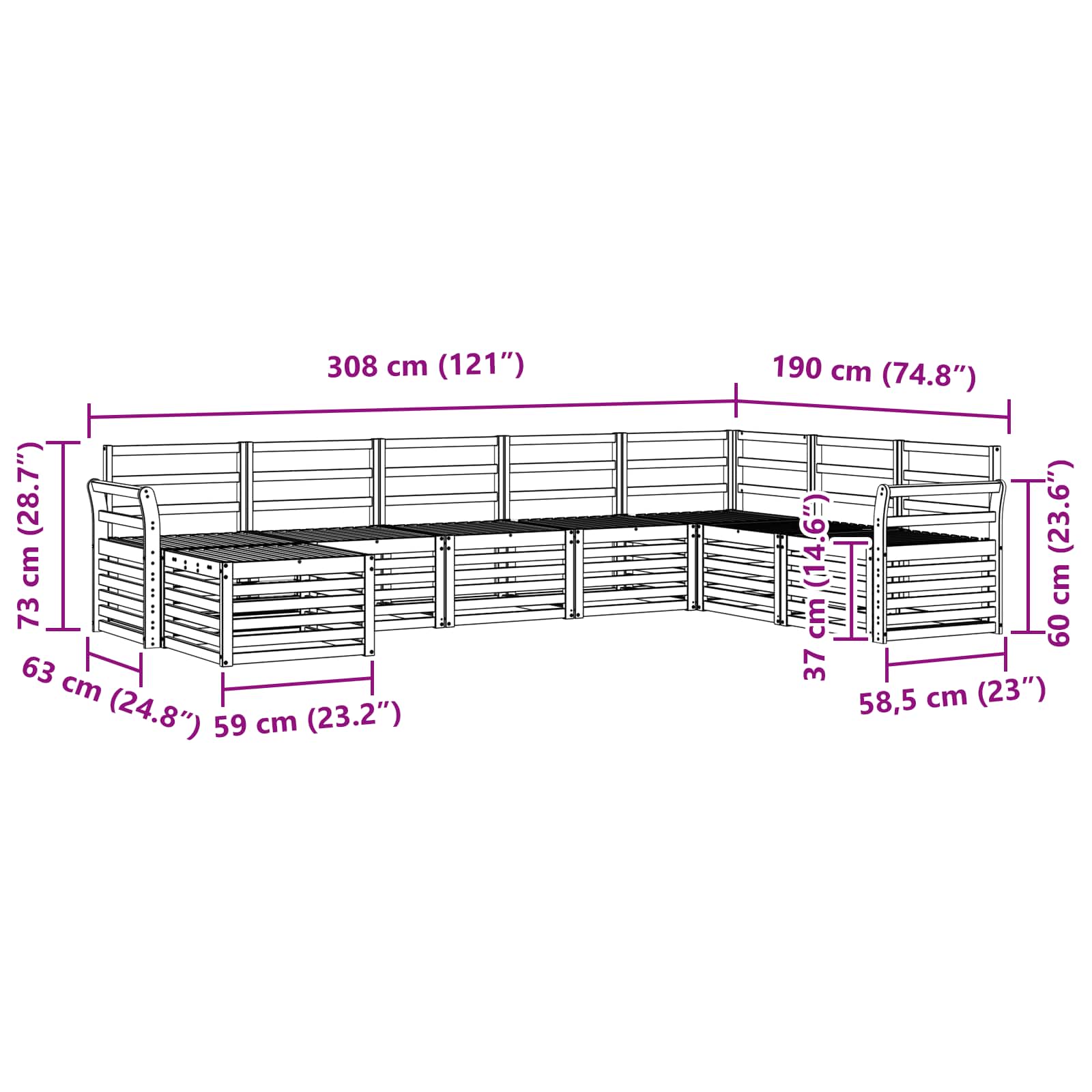 - 6 x Canapea de mijloc: 63 x 59 x 73 cm (LxWxH)
