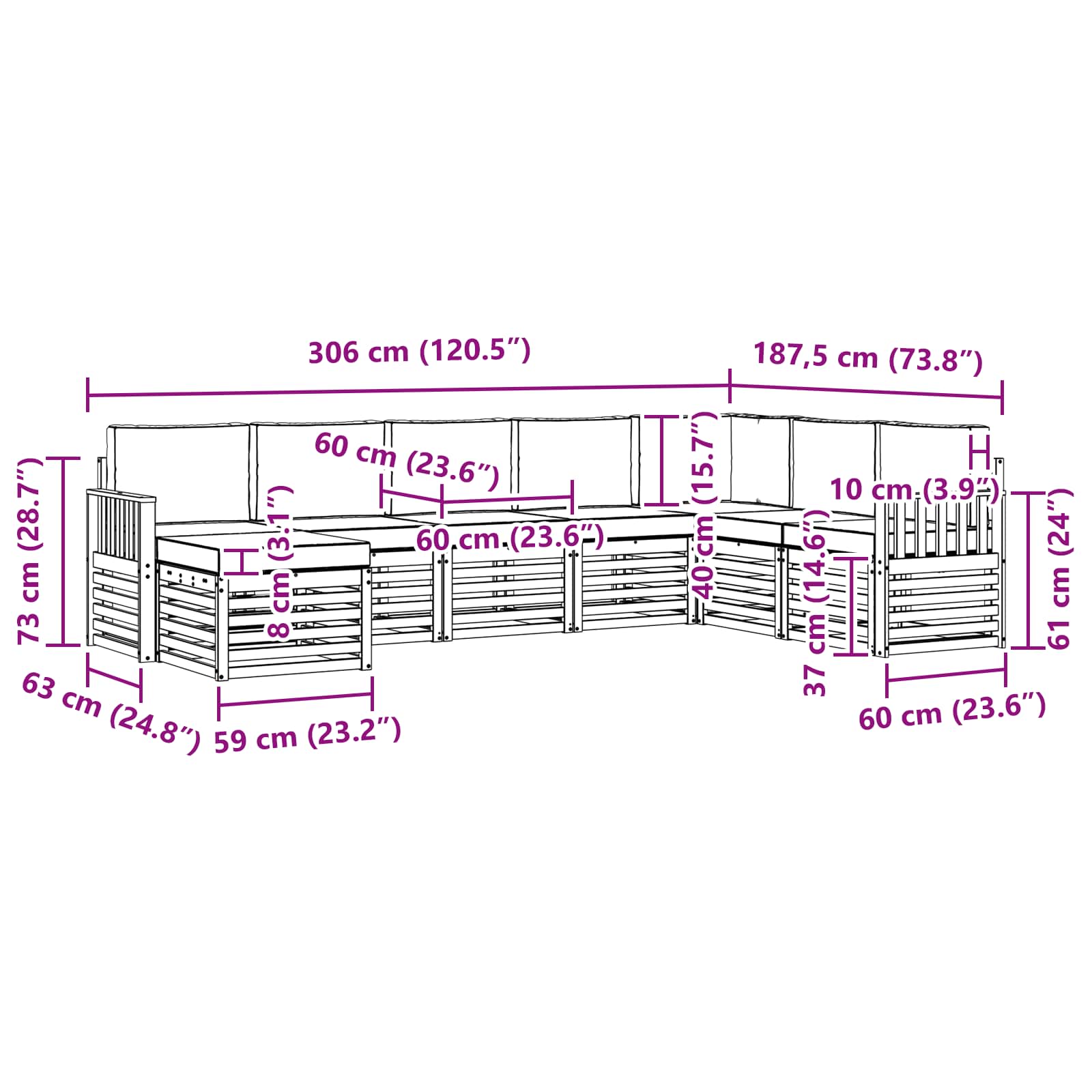 - 6 x Canapea de mijloc: 63 x 59 x 73 cm (LxWxH)