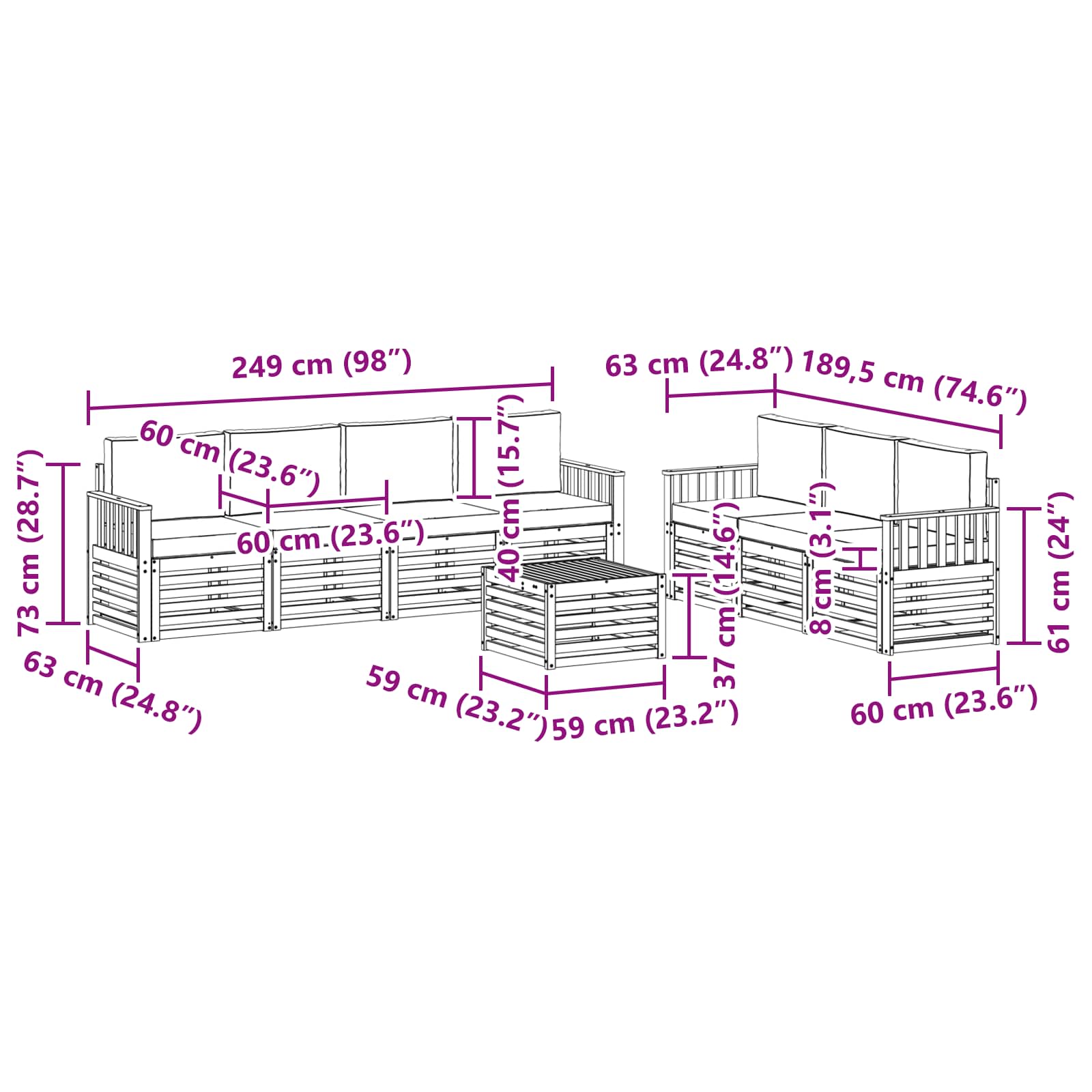 - 7 x Canapea medie: 63 x 59 x 73 cm (LxWxH)