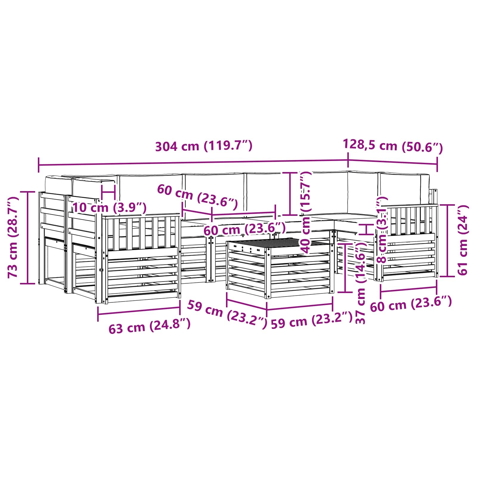 - 7 x perne pentru șezut: 60 x 60 x 8 cm (LxWxH)