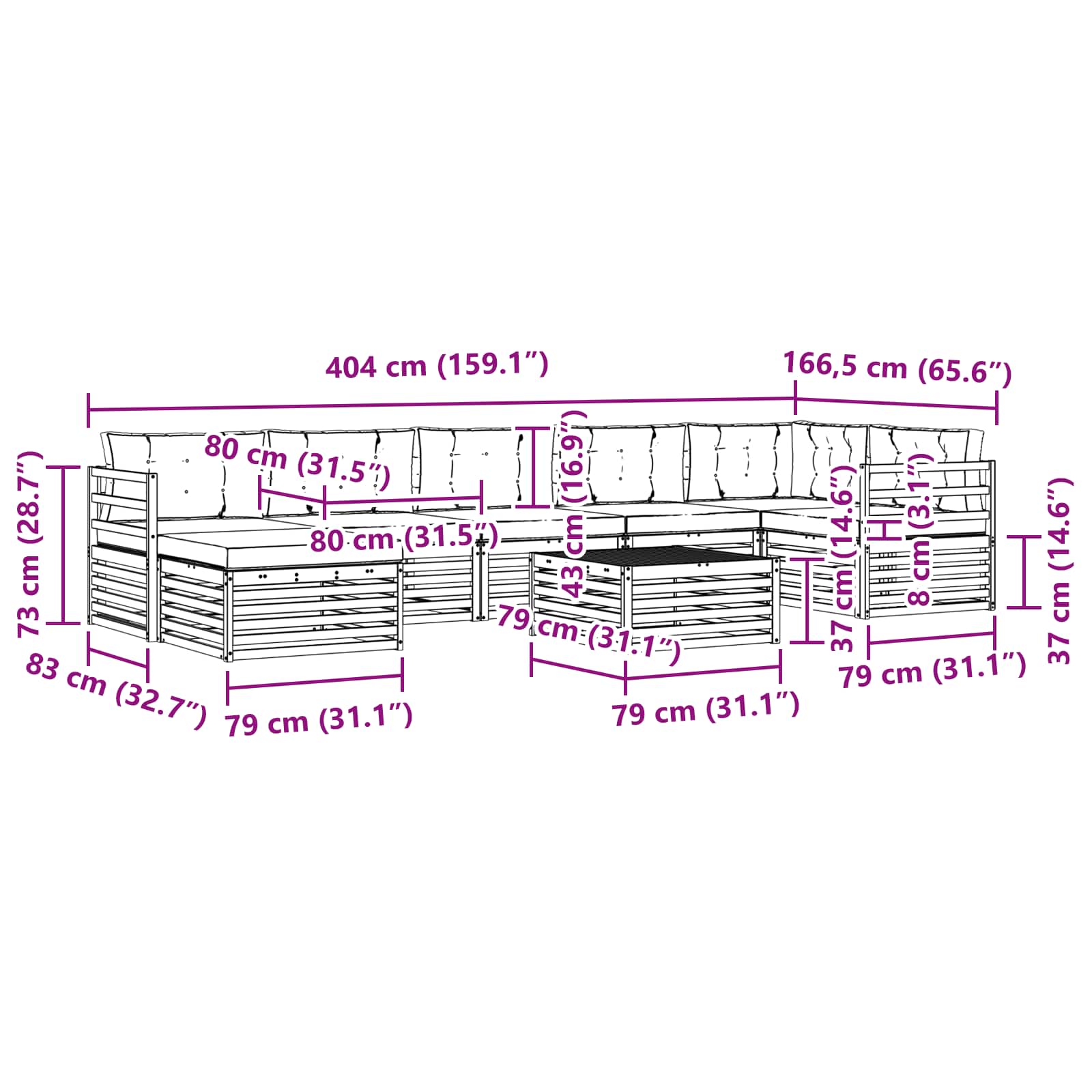 - 7 x Pernă de șezut: 80 x 80 x 8 cm (LxWxH)