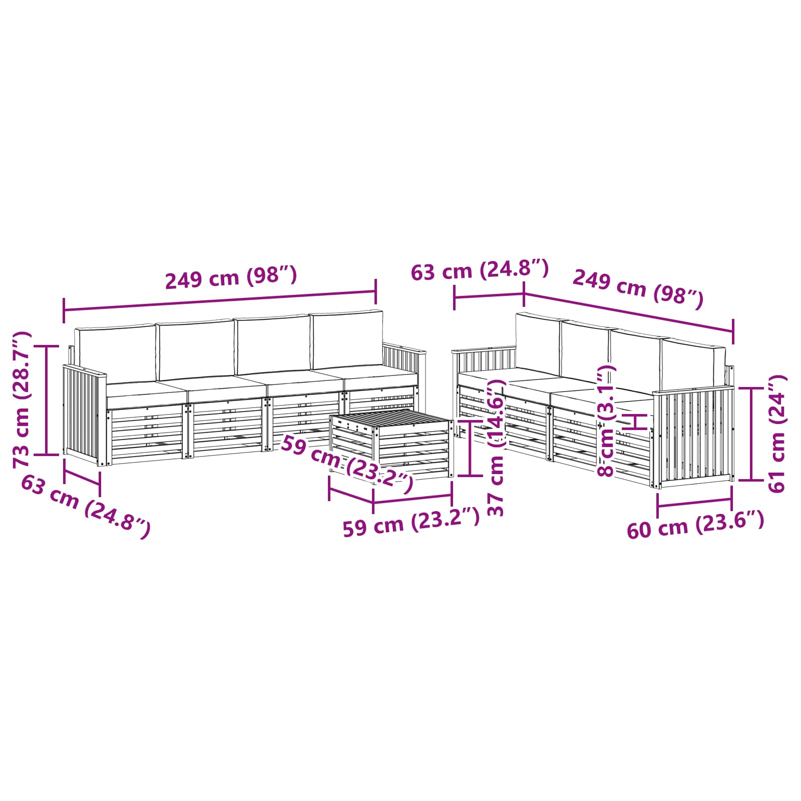 - 8 x Canapea din mijloc: 63 x 59 x 73 cm (LxWxH)