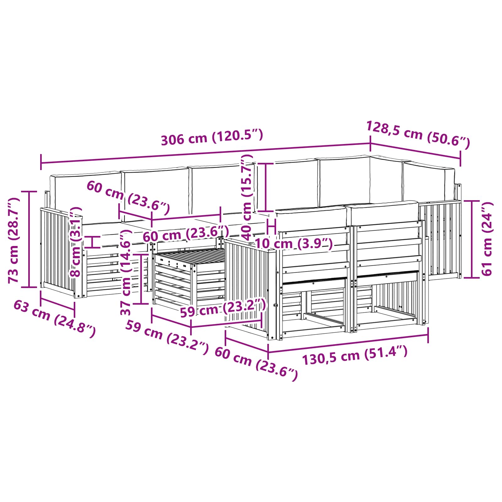 - 7 x Canapea mijloc: 63 x 59 x 73 cm (LxWxH)