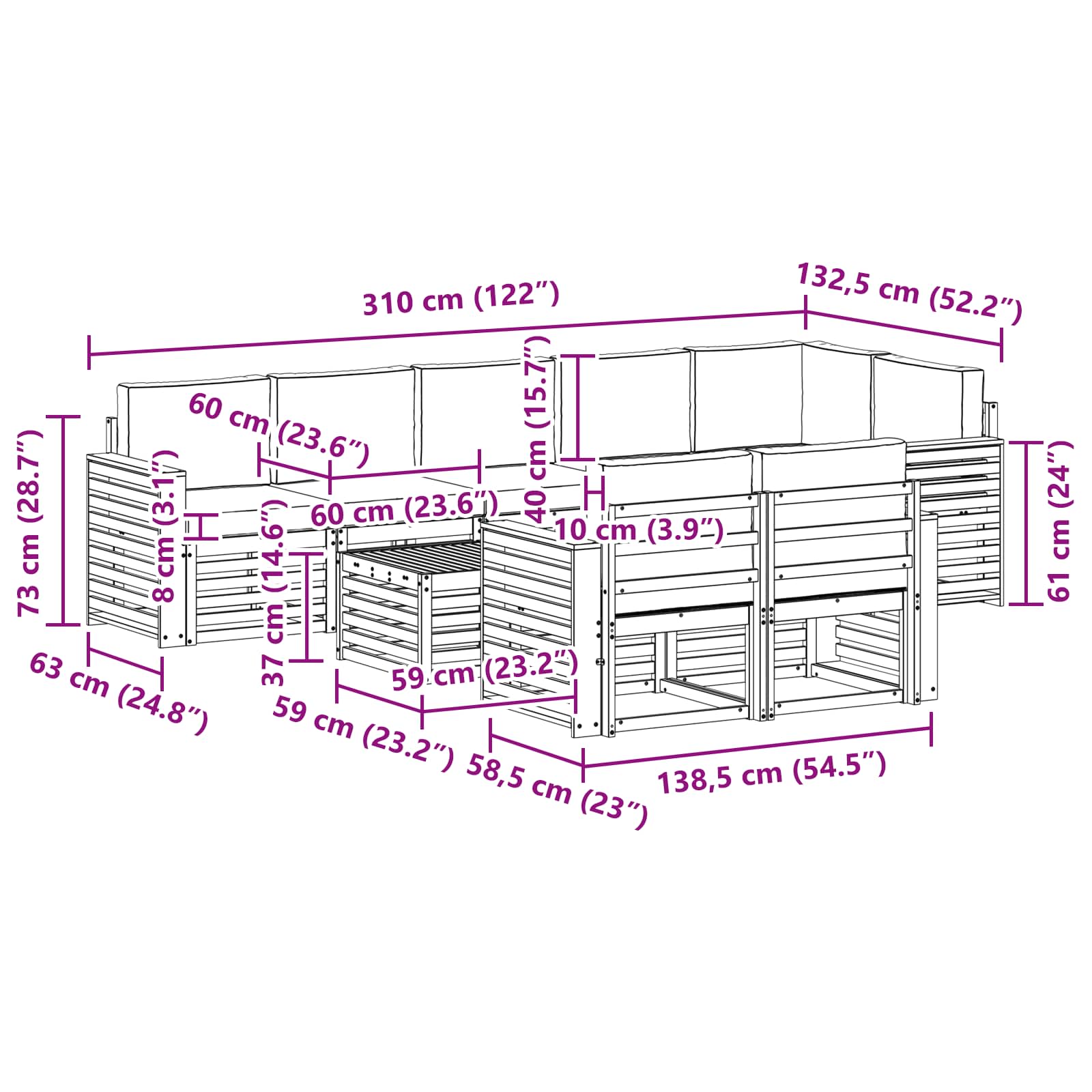 - 7 x Canapea mijloc: 63 x 59 x 73 cm (LxWxH)