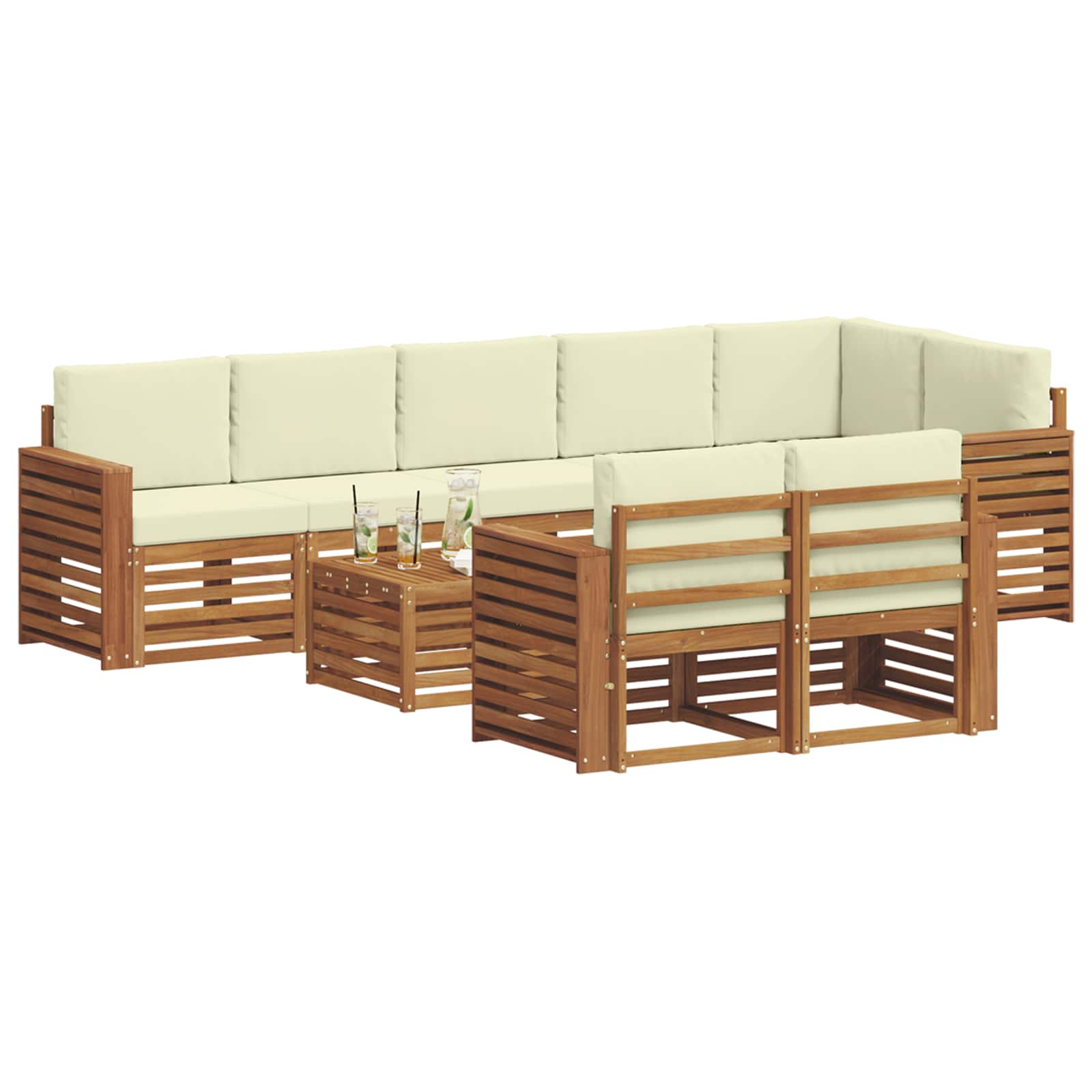 Setul ăsta de canapele sezlonguri pentru exterior, ideal pentru grădină, terasă sau piscine, aduce un stil modern cu designul său actual. Lemnul masiv de acacia maro adaugă un vibe cald și elegant, făcându-l locul perfect de întâlnire pentru relaxare pe atât de termene sociale. Componentele modulare pot fi rearanjate după cum ai nevoie, oferind flexibilitate și un aranjament personalizat.