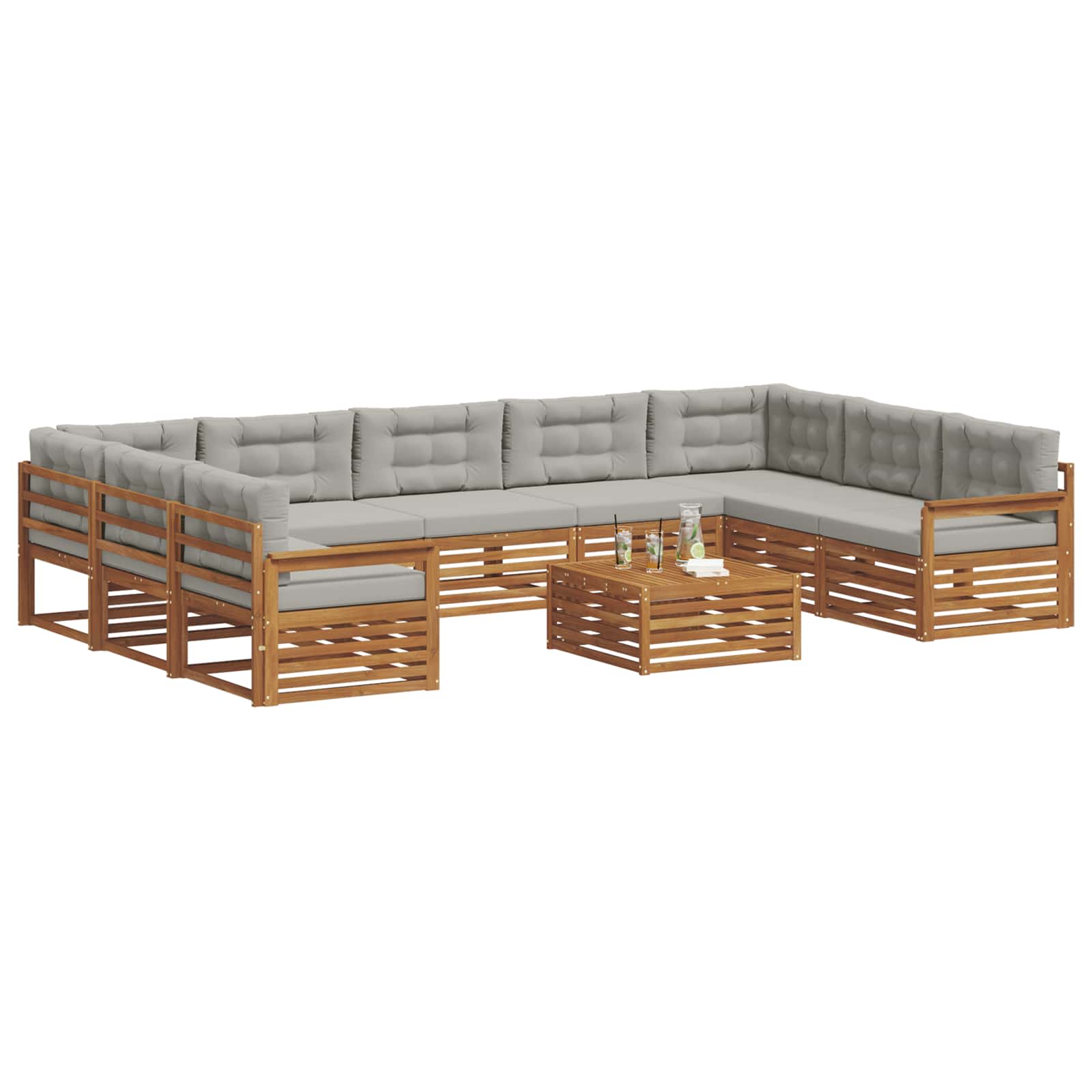 Setul de mobilă pentru exterior aduce împreună stilul și funcționalitatea, transformându-ți grădina sau terasa într-un loc de relaxare. Designul său modern cu linii simple și detalii subtile ajută la crearea unei atmosfere elegante, perfectă pentru petreceri în aer liber. Tot din lemn masiv de acacia, setul e durabil și arată bine pe termen lung, ideal pentru cei care caută mobilier practic, dar și rafinat.