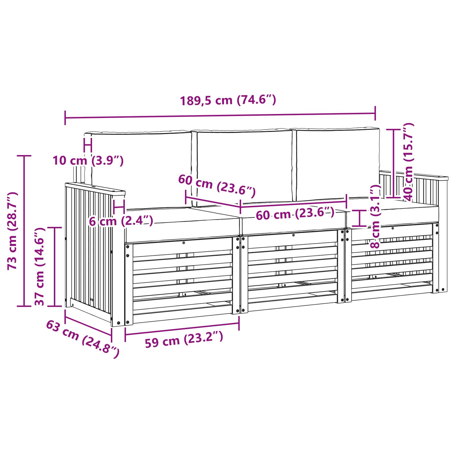 - 3 x Canapea mijlocie: 63 x 59 x 73 cm (LxWxH)