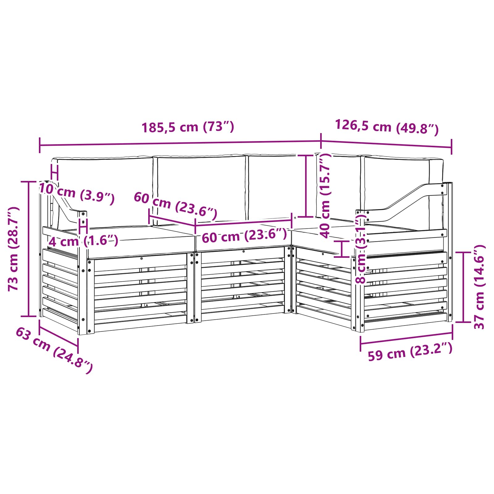 - 1 x canapea colț: 63 x 63 x 73 cm (LxWxH)