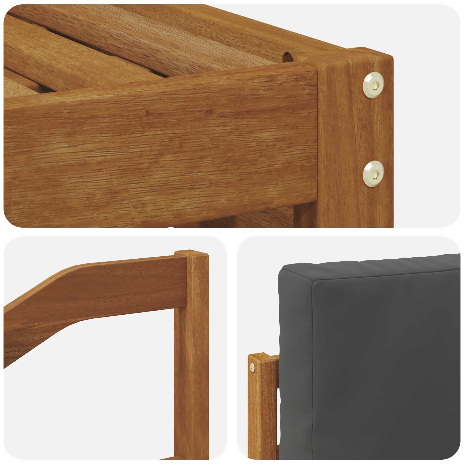 - Excelent lemn masiv de acacia: Setul de canapea e făcut din lemn masiv de acacia, cunoscut pentru rezistența lui și aspectul natural atrăgător. E ideal pentru exterior, rezistând la vreme, dar arată și bine.