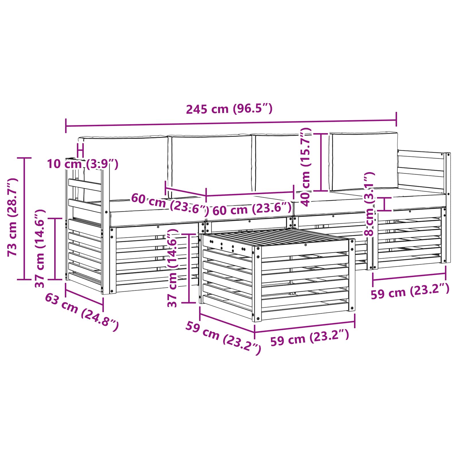 - 4 x Canapea de mijloc: 63 x 59 x 73 cm (LxWxH)