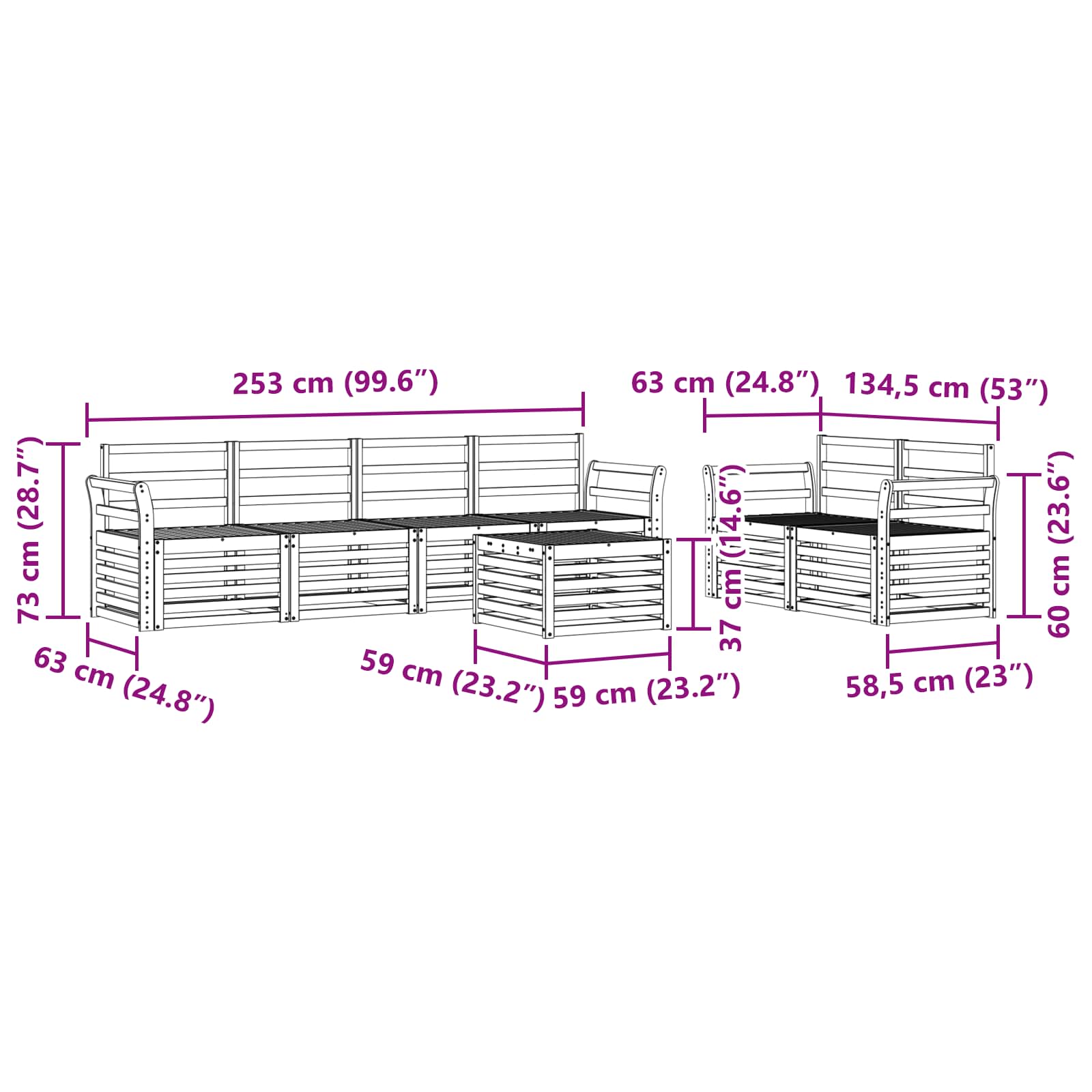 - 6 x Canapea mijlocie: 63 x 59 x 73 cm (LxWxH)