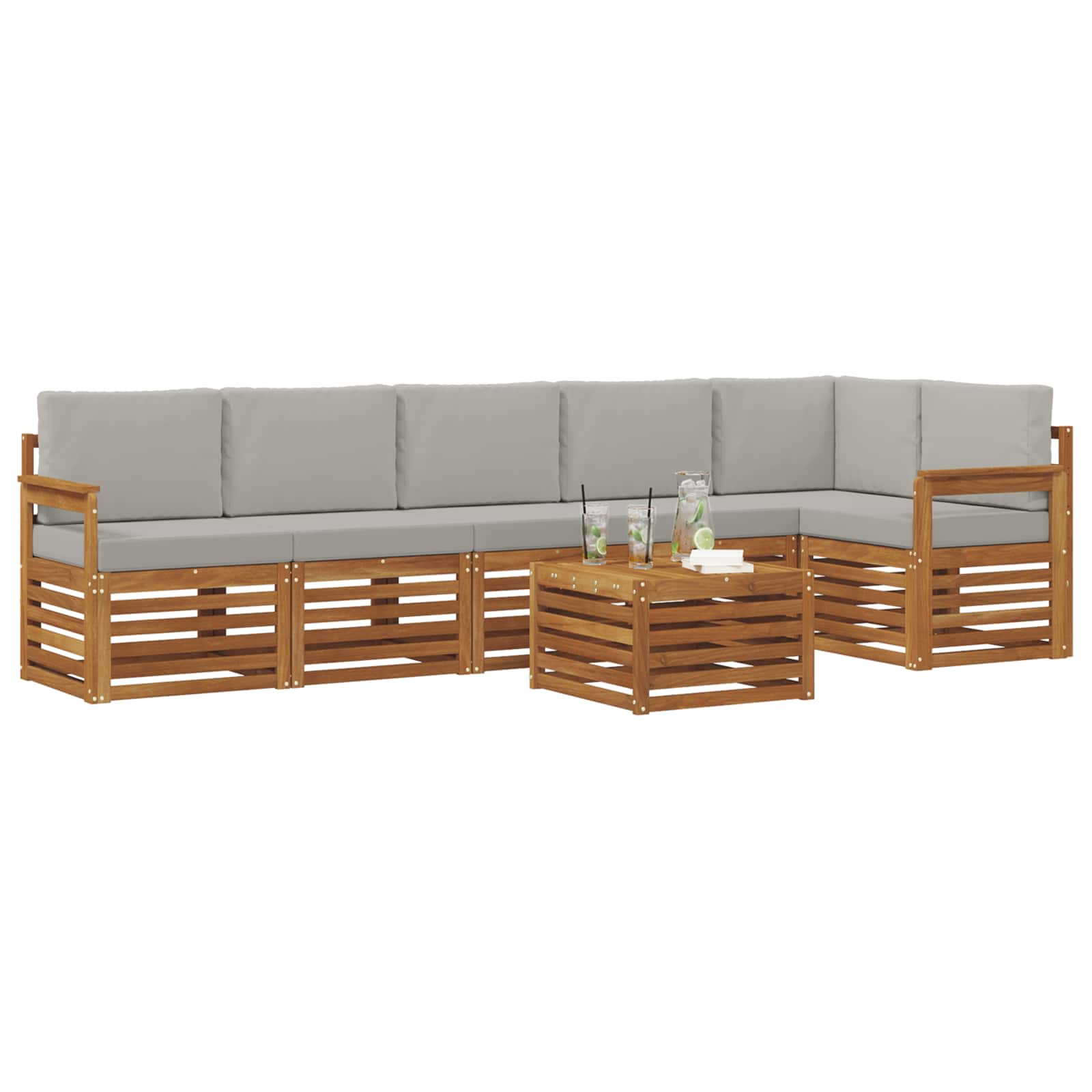 Setul nostru de canapele secționale pentru exterior, din lemn masiv de acacia, combină stilul cu rezistența, fiind ideal pentru grădini, terase sau lângă piscină. Cu un design modern și chic, aceste piese oferă o aranjare modulară versatilă care se potrivește oricărui spațiu și ocazie. Creează o atmosferă relaxantă și plăcută cu nuanțele sale de maro, ce se integrează perfect în natură, fie că e vorba de o după-amiază leneșă sau o întâlnire veselă.