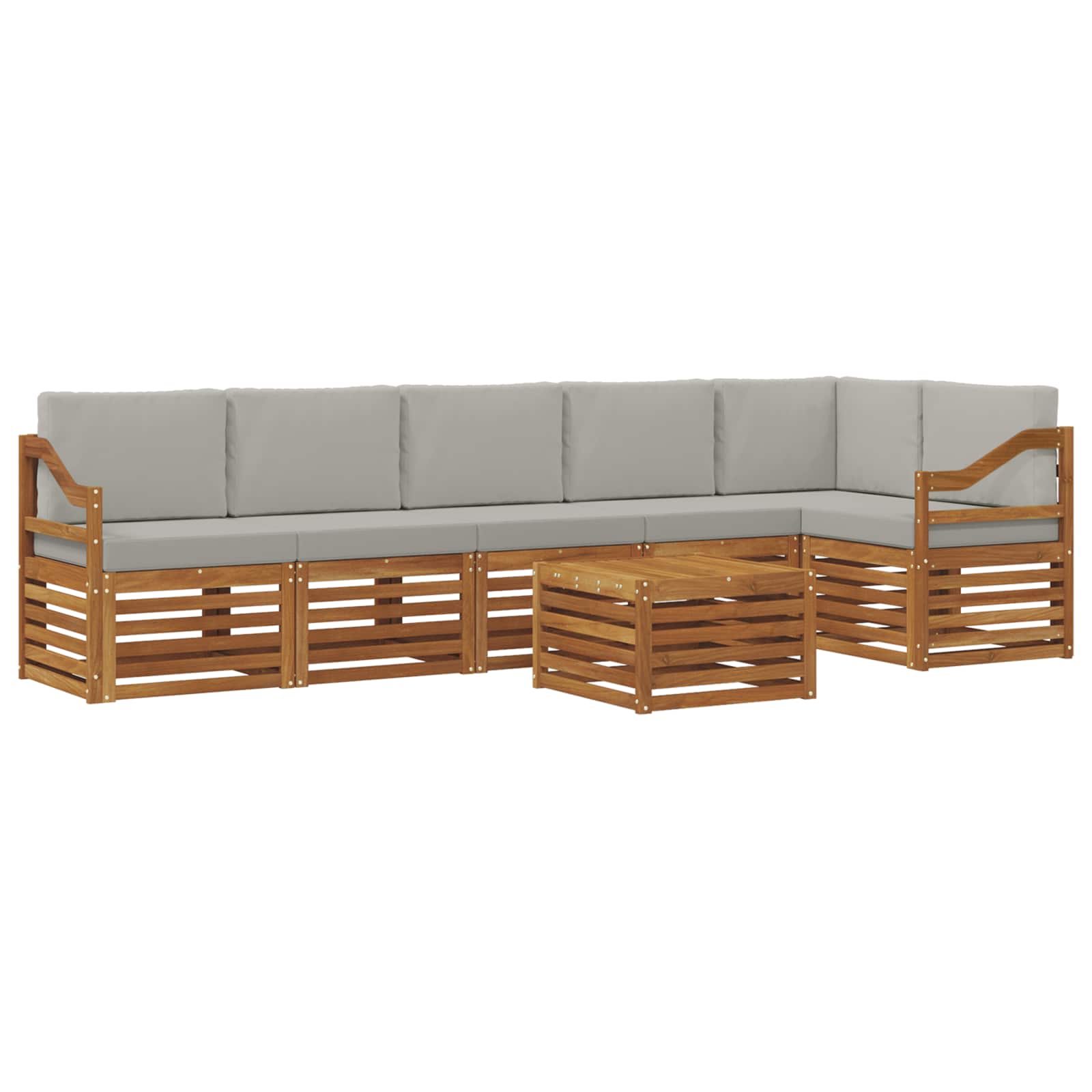 Setul nostru de canapele secționale pentru exterior, din lemn masiv de acacia, combină stilul cu rezistența, fiind ideal pentru grădini, terase sau lângă piscină. Cu un design modern și chic, aceste piese oferă o aranjare modulară versatilă care se potrivește oricărui spațiu și ocazie. Creează o atmosferă relaxantă și plăcută cu nuanțele sale de maro, ce se integrează perfect în natură, fie că e vorba de o după-amiază leneșă sau o întâlnire veselă.