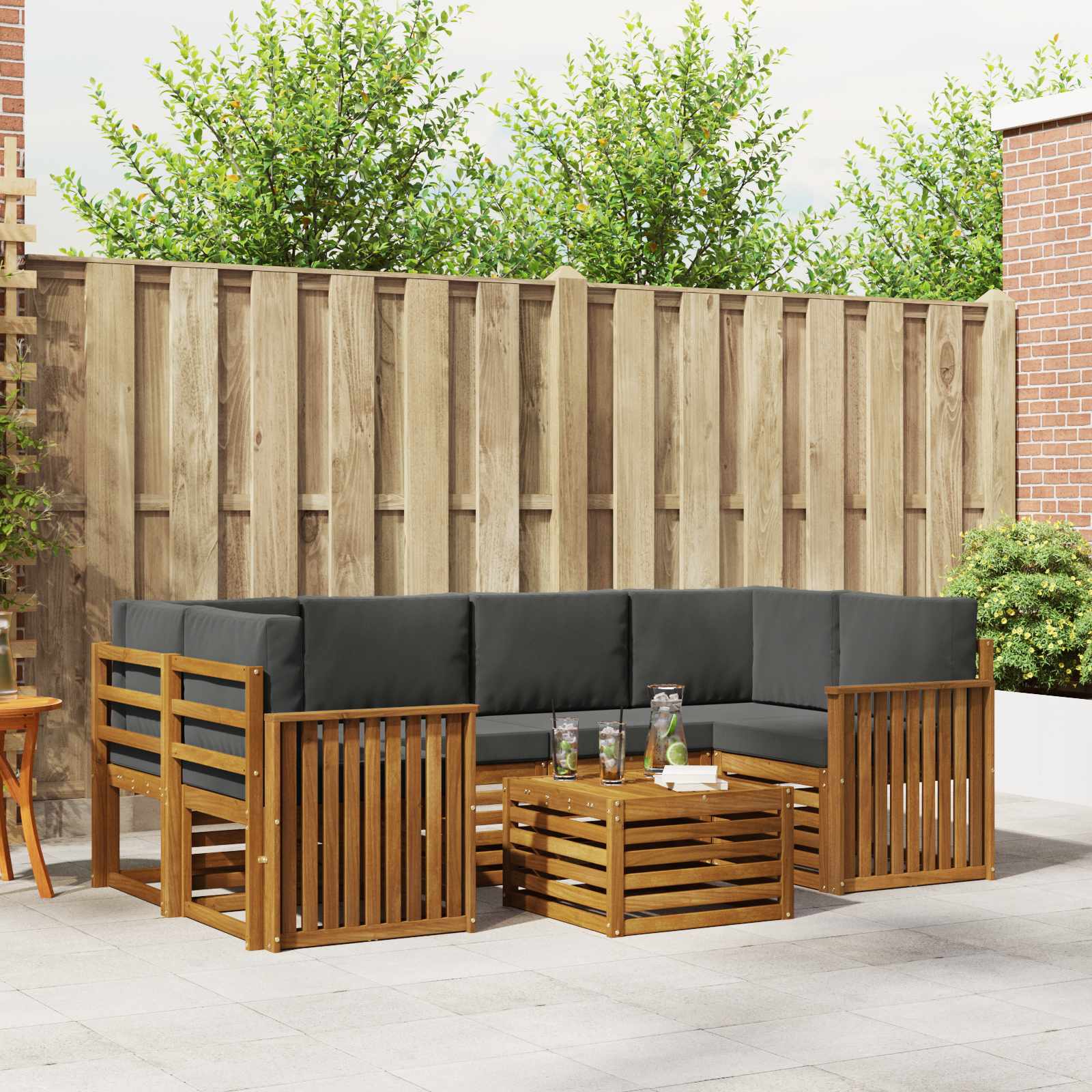 Setul ăsta de mobilier de exterior leagă stilul și funcția, făcându-l piesa centrală perfectă pentru grădina sau terasa ta. Cu un design modern, linii clare și detalii simple, aduce eleganță și susține relaxarea și socializarea afară. Fiind din lemn de acacia masiv, setul e durabil și arată bine pe termen lung, ideal pentru oricine caută un design chic în mobilierul de exterior.