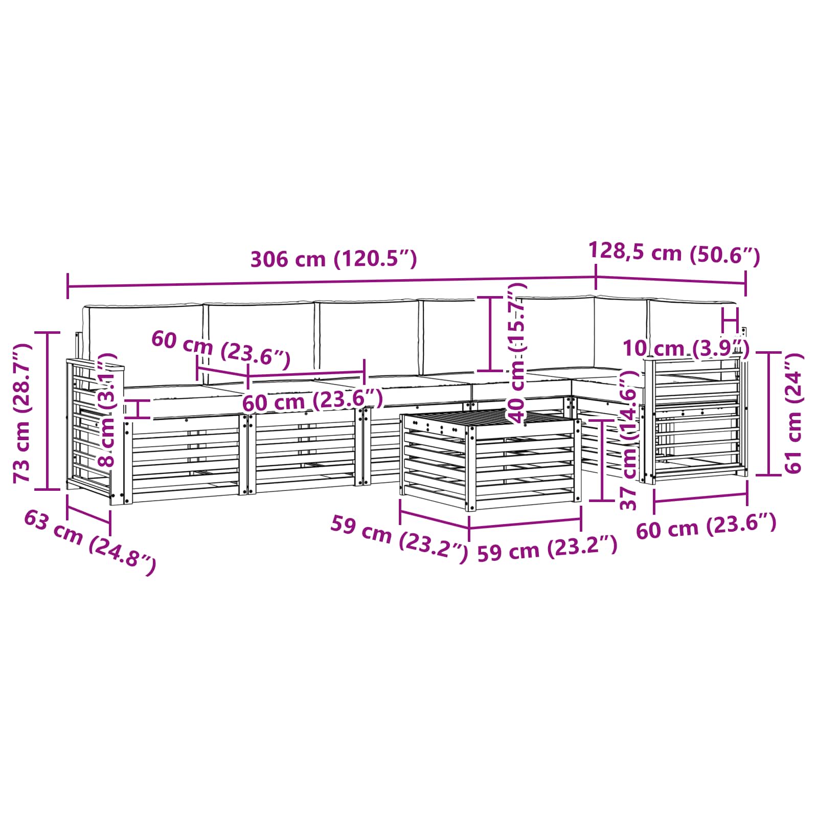 - 5 x canapea mijloc: 63 x 59 x 73 cm (LxWxH)