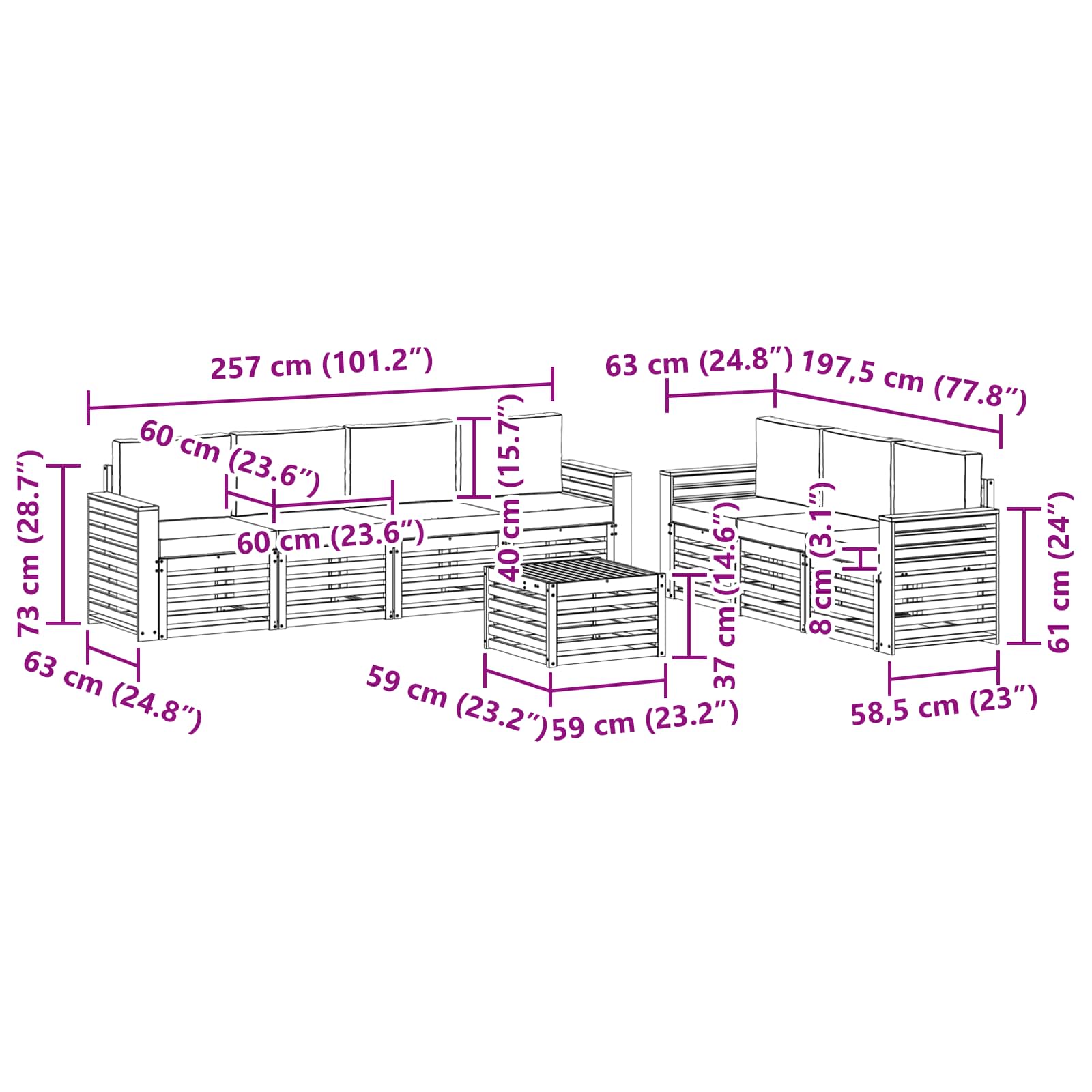 - 7 x Canapea medie: 63 x 59 x 73 cm (LxWxH)