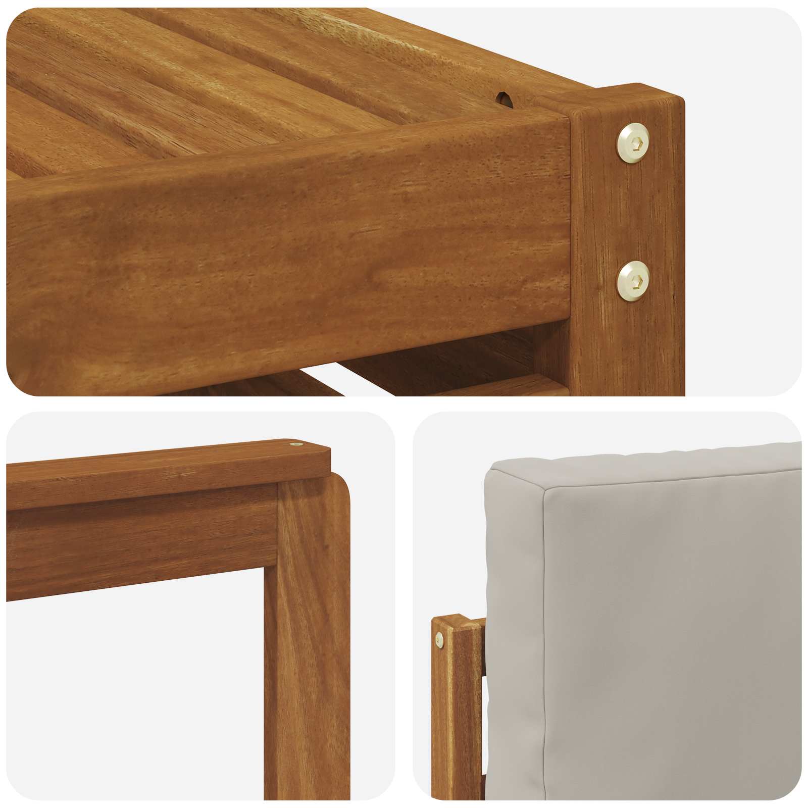 Setul de mobilier de exterior combină stilul cu funcționalitatea, fiind un punct de atracție pentru grădini și terase. Designul modern, cu linii clare, adaugă un plus de eleganță. Făcut din lemn solid de acacia, asigură durabilitate și un aspect fain pe termen lung.