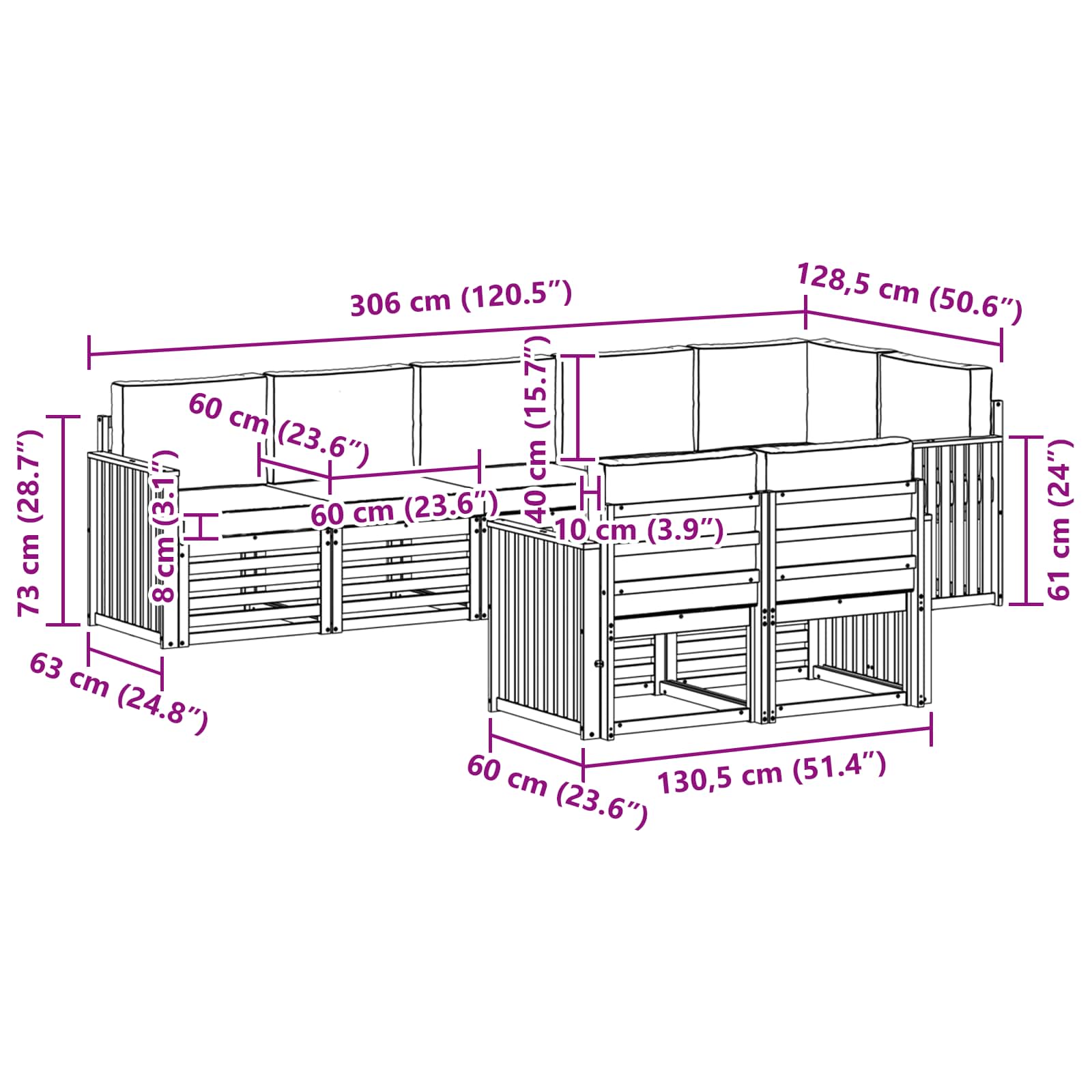 - 7 x canapea din mijloc: 63 x 59 x 73 cm (LxWxH)