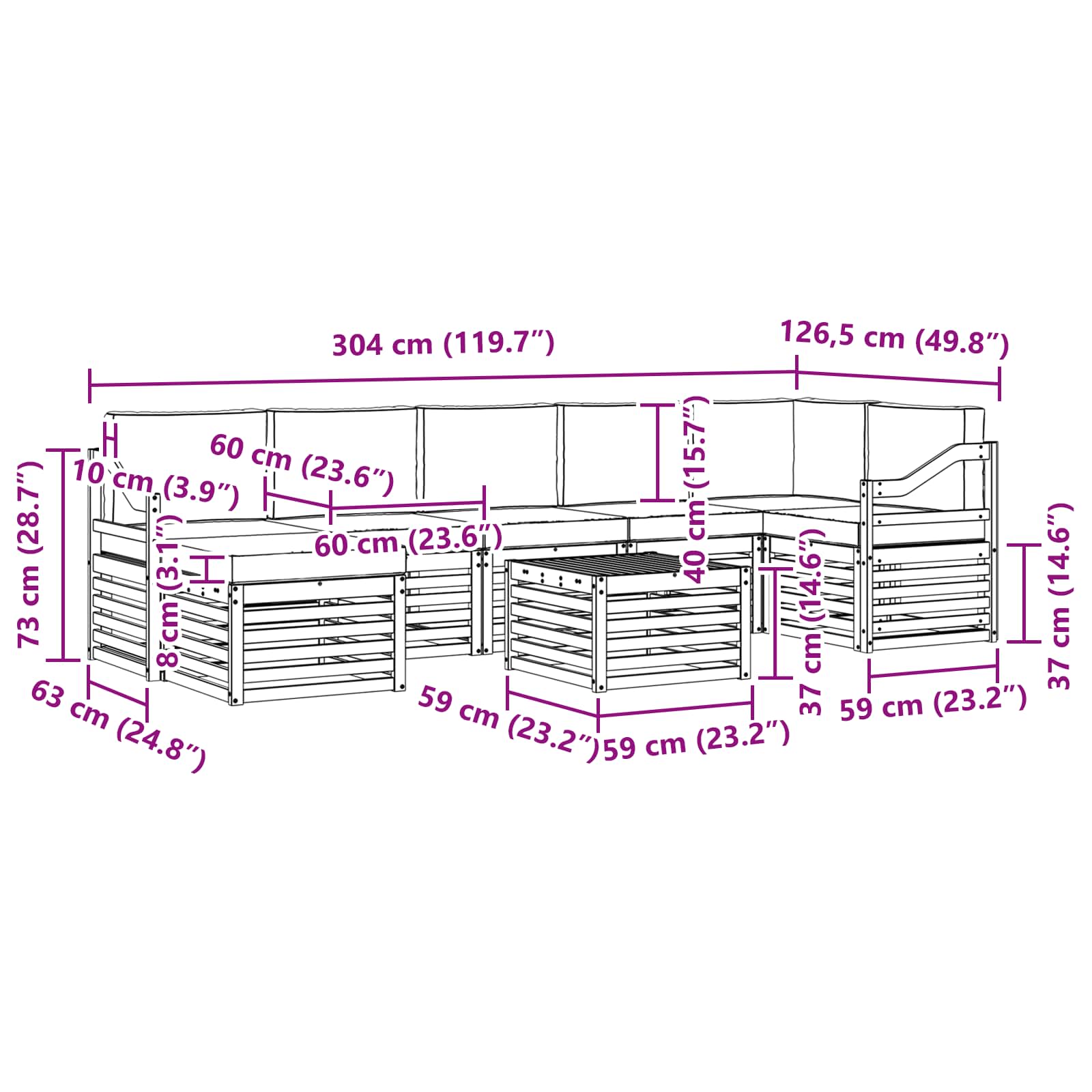 - 5 x canapea de mijloc: 63 x 59 x 73 cm (LxWxH)