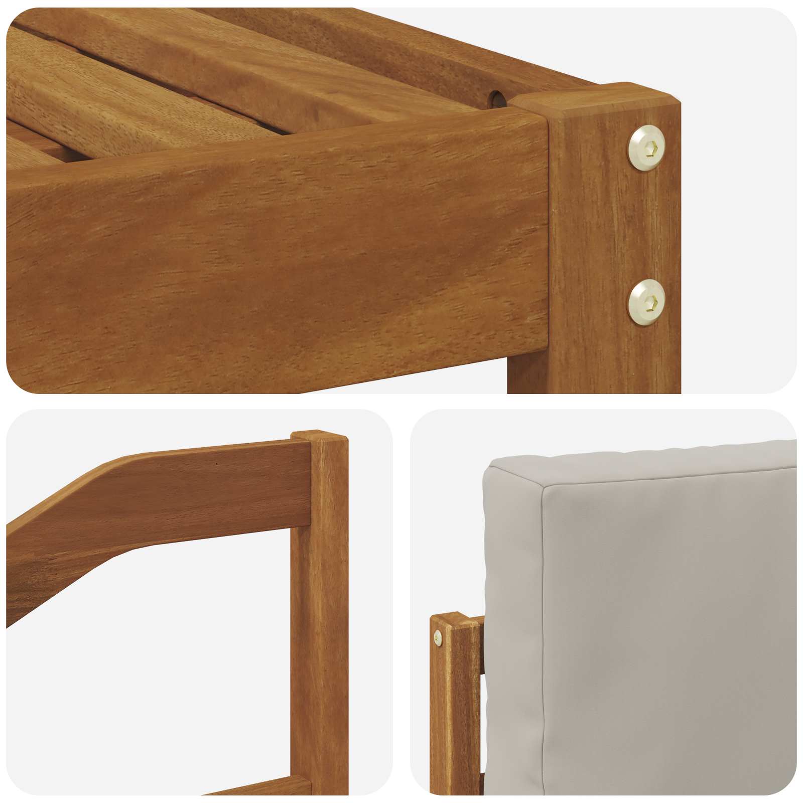 Setul ăsta de mobilier pentru afară combină stilul cu utilitatea, fiind un punct focal tare în orice grădină sau terasă. Designul lui modern, cu linii clare și detalii simple, aduce eleganță și îmbunătățește momentele de relaxare în aer liber cu prietenii. Făcut din lemn masiv de acacia, asigură durabilitate și un aspect care rezistă în timp, fiind alegerea ideală pentru cei care caută atât utilitate cât și un design chic pentru mobilierul de exterior.