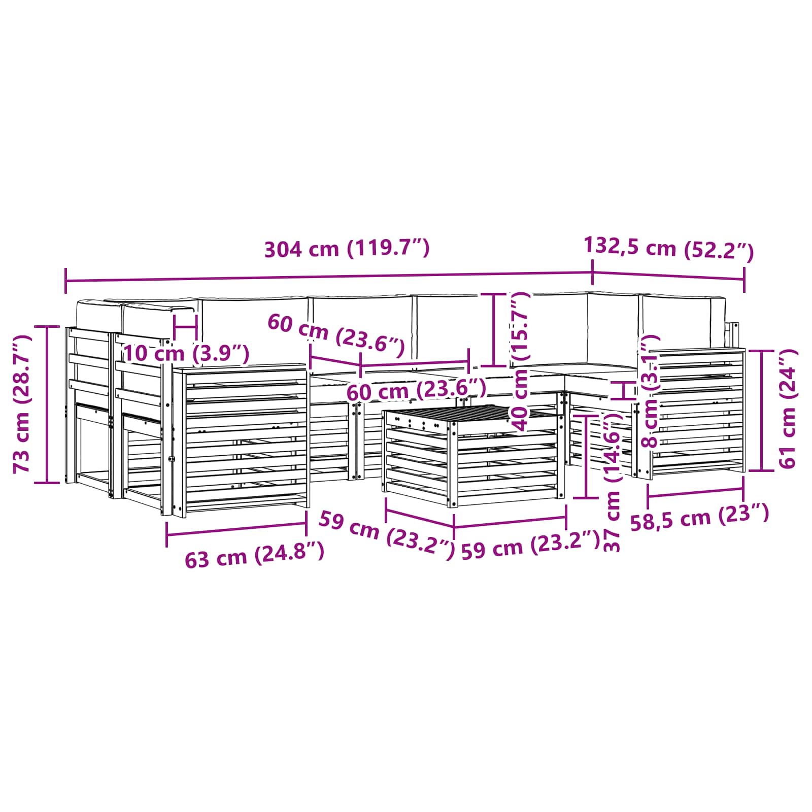 - 7 x Pernă de șezut: 60 x 60 x 8 cm (LxWxH)