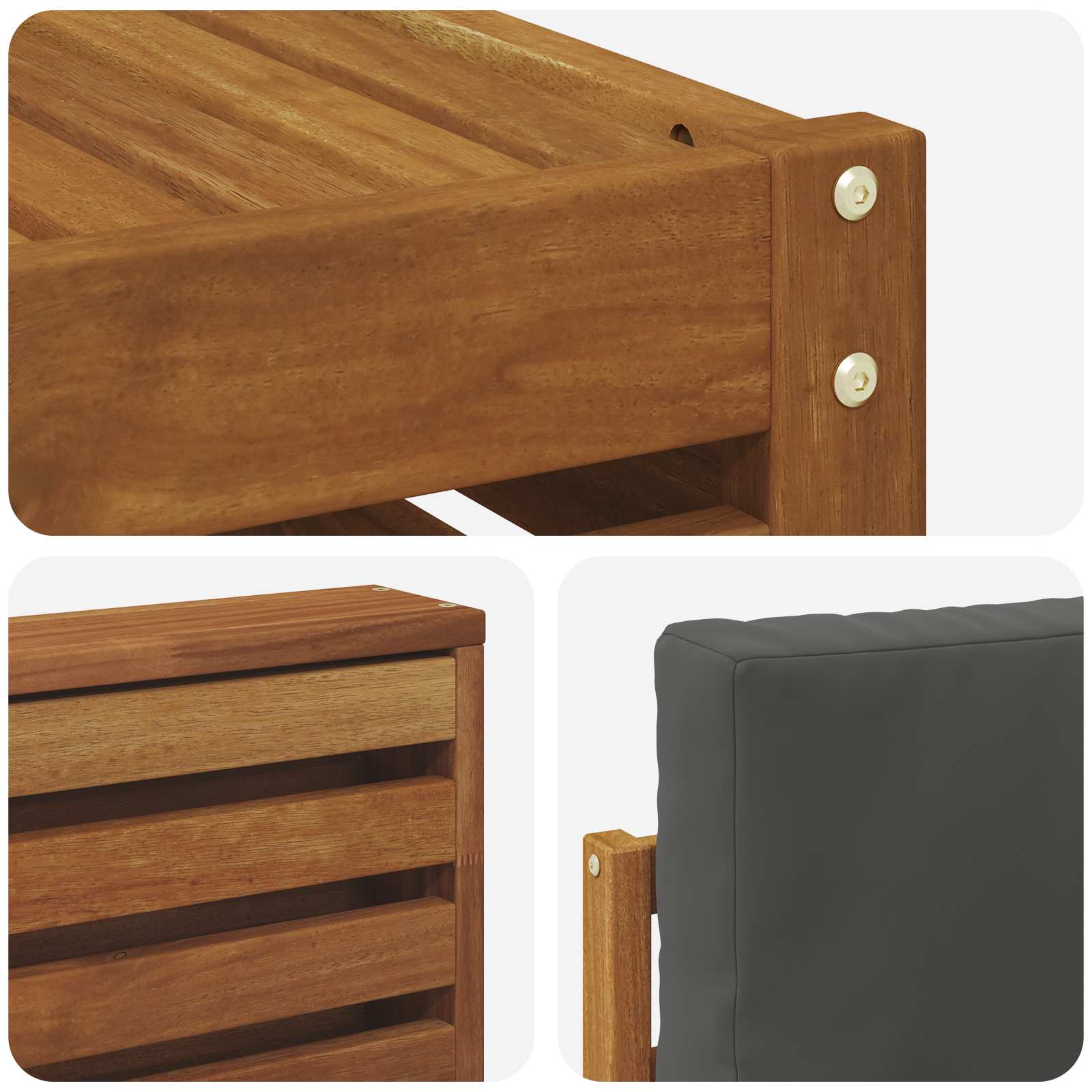 Setul de mobilier de exterior combină stilul cu funcționalitatea, fiind un punct de atracție pentru grădini și terase. Designul modern, cu linii clare, adaugă un plus de eleganță. Făcut din lemn solid de acacia, asigură durabilitate și un aspect fain pe termen lung.
