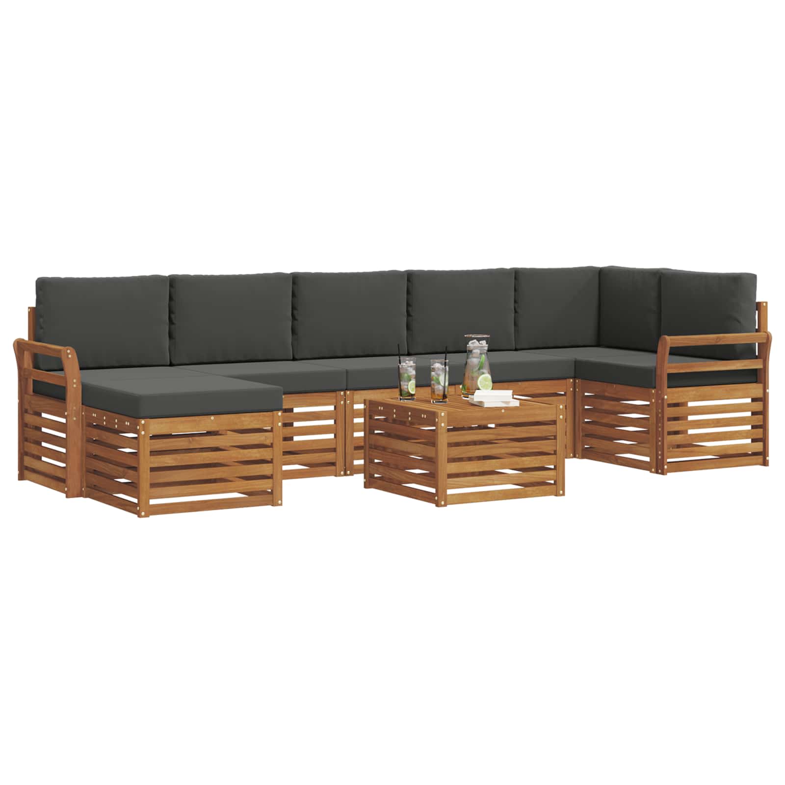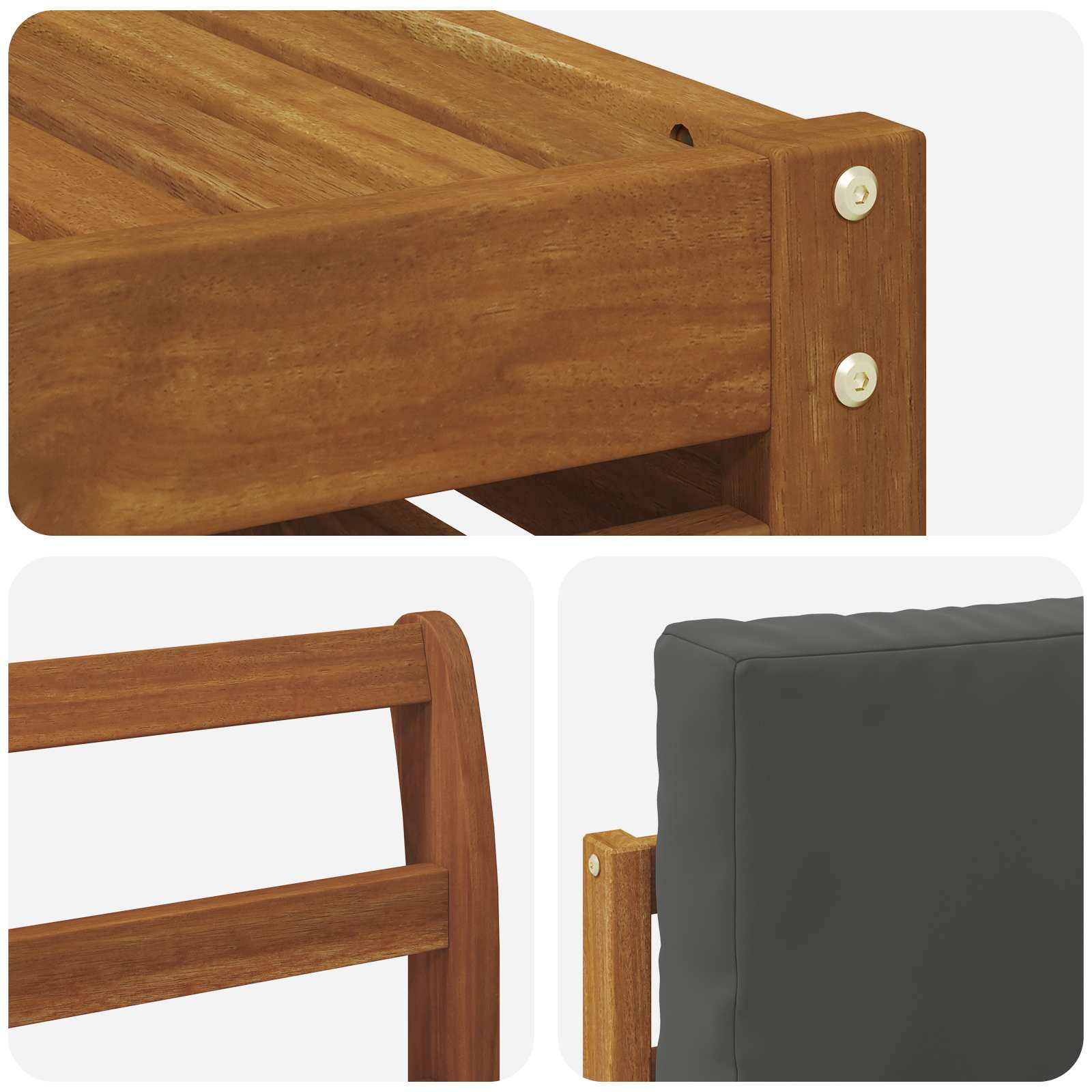 Setul ăsta de mobilier pentru exterior e combinația perfectă între stil și funcționalitate, făcându-l un magnet de priviri pentru orice grădină sau terasă. Designul modern, cu linii clare și detalii simple, aduce eleganță și asigură relaxare afară, fiind ideal pentru întâlniri sociale. E făcut 100% din lemn de acacia masiv, deci e durabil și arată bine mult timp, fiind alegerea perfectă pentru cei care vor un mix de practică și un look rafinat.