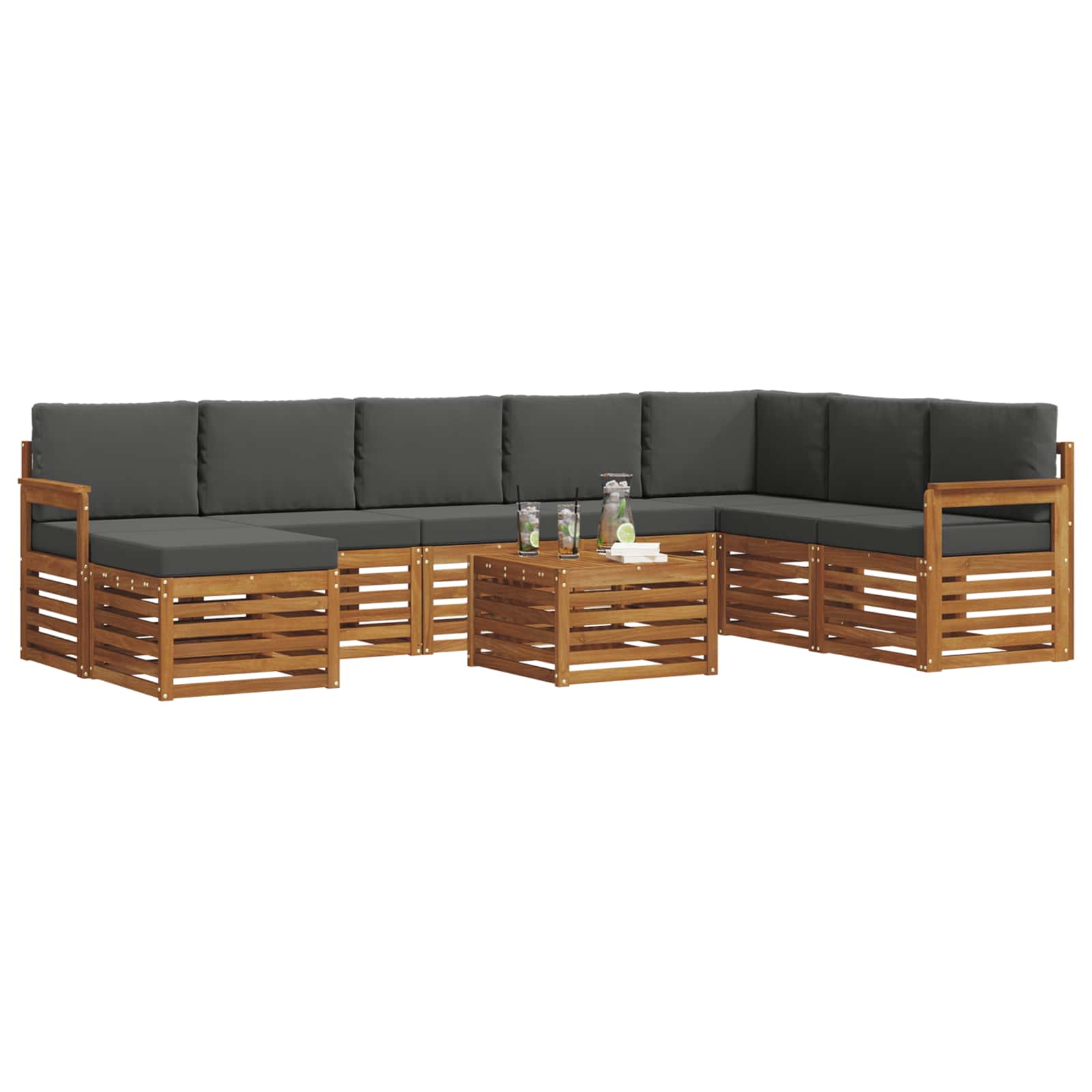 Setul de mobilier pentru exterior îmbină stilul cu funcționalitatea, fiind un punct de atracție în orice grădină sau terasă. Cu un design modern și linii curate, aduce eleganță și creează un loc perfect pentru relaxare și socializare. Fabricat din lemn masiv de acacia, e durabil și are un aspect atrăgător, ideal pentru cei care caută utilitate și stil.