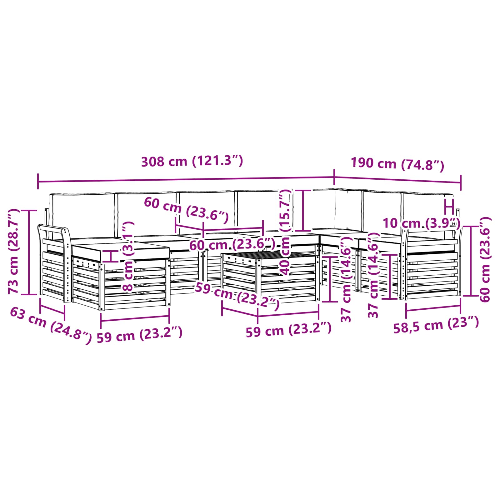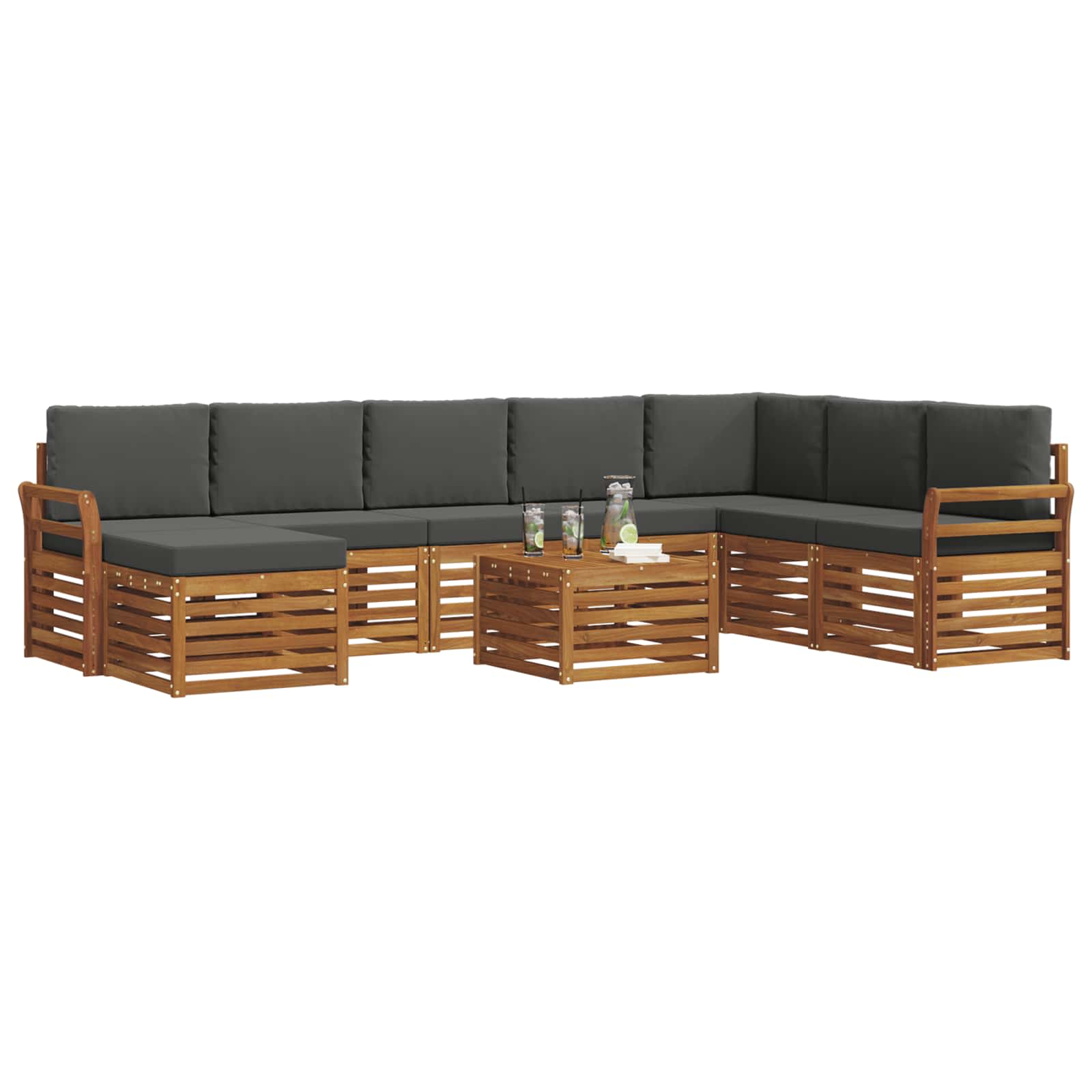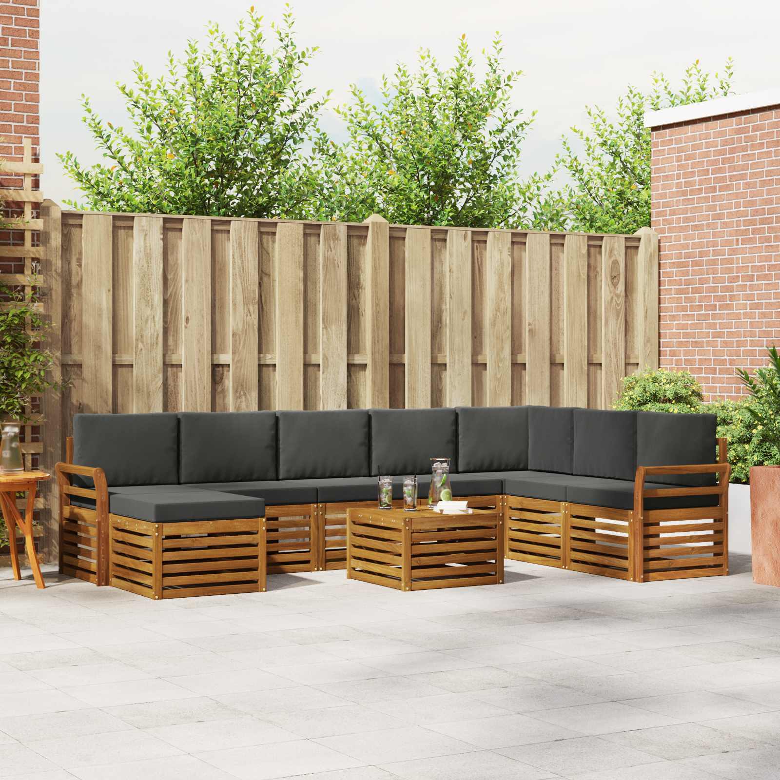 Setul de mobilier pentru exterior îmbină stilul cu funcționalitatea, fiind un punct de atracție în orice grădină sau terasă. Cu un design modern și linii curate, aduce eleganță și creează un loc perfect pentru relaxare și socializare. Fabricat din lemn masiv de acacia, e durabil și are un aspect atrăgător, ideal pentru cei care caută utilitate și stil.