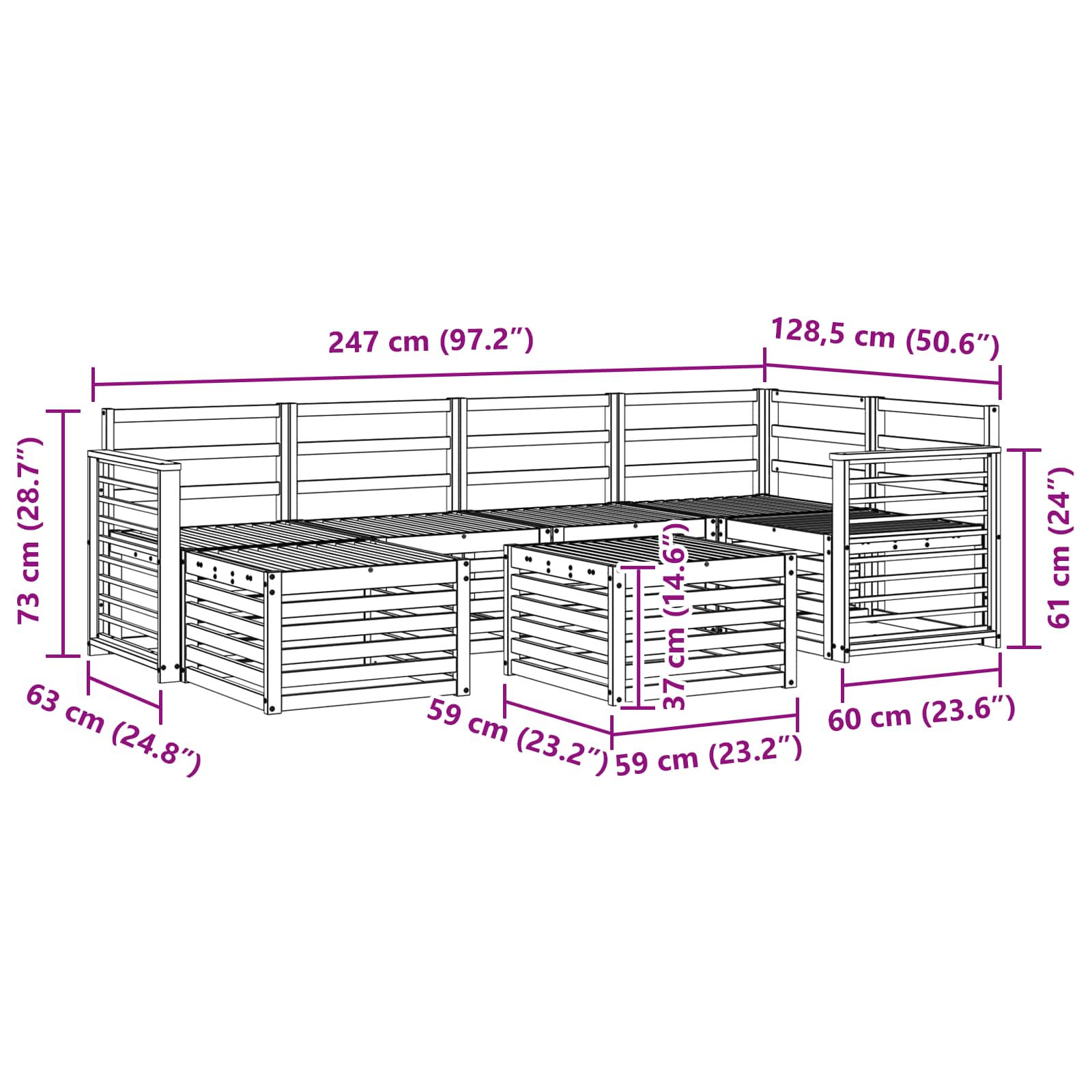 - 4 x Canapea mijloc: 63 x 59 x 73 cm (LxWxH)