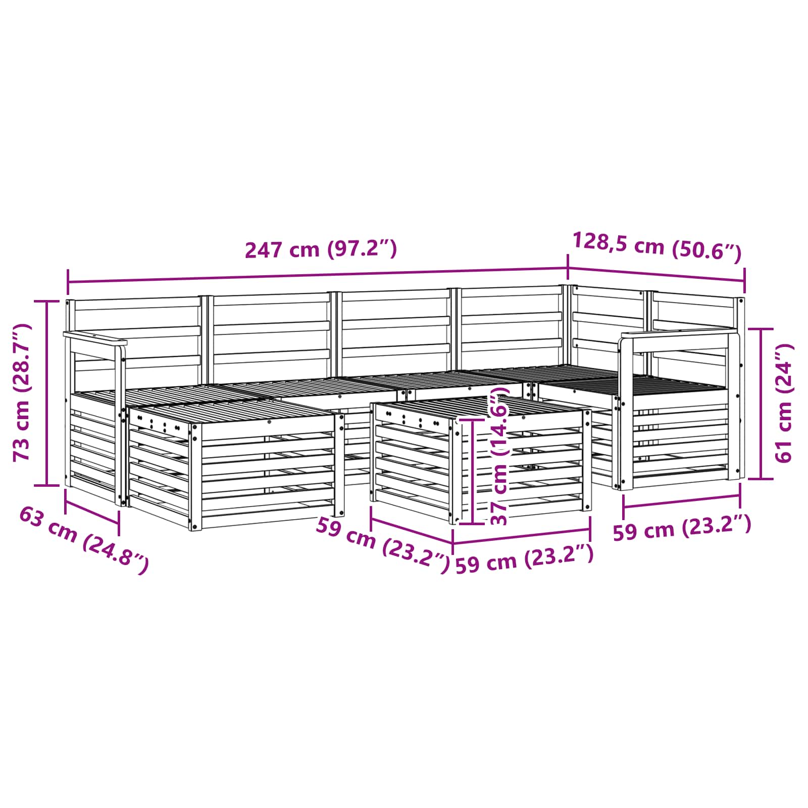 - 4 x Canapea mijloc: 63 x 59 x 73 cm (LxWxH)