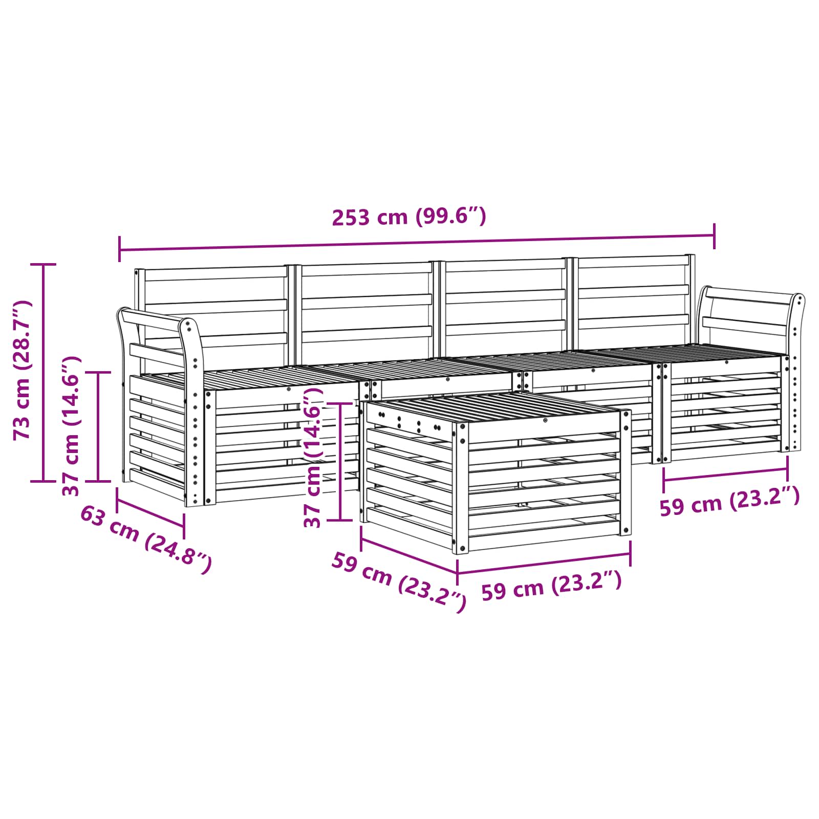 - 4 x Canapea mijlocie: 63 x 59 x 73 cm (LxWxH)